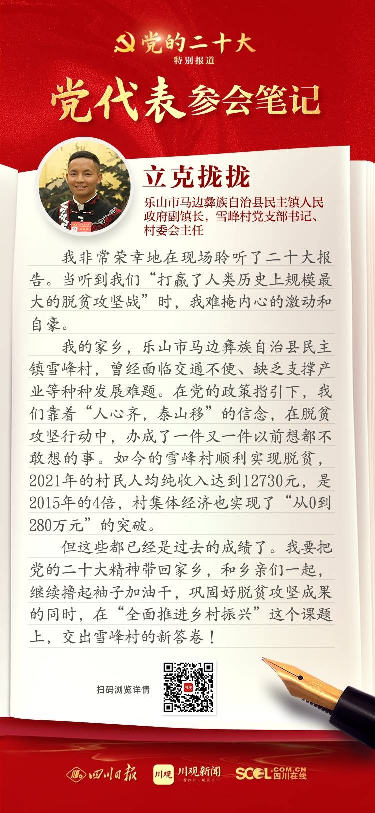 出席盛会,来自四川的党代表深感使命光荣、责任重大,大家认真履职,结合报告谈认识、谈体会、谈打算。川观新闻特此推出“党代表参会笔记”栏目,分享党代表们的参会心得,敬请垂注。