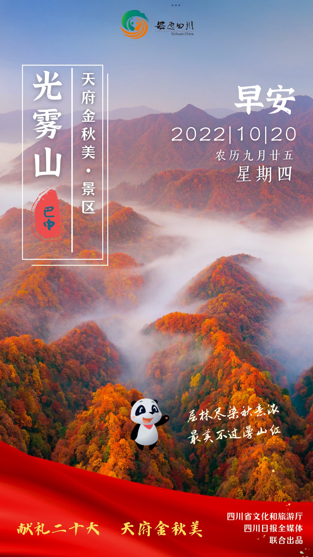 10月20日,星期四。今日映入眼帘的是天府金秋美景之“红地毯”——光雾山。当下的光雾山,已是层林尽染秋意浓,最美不过漫山红。