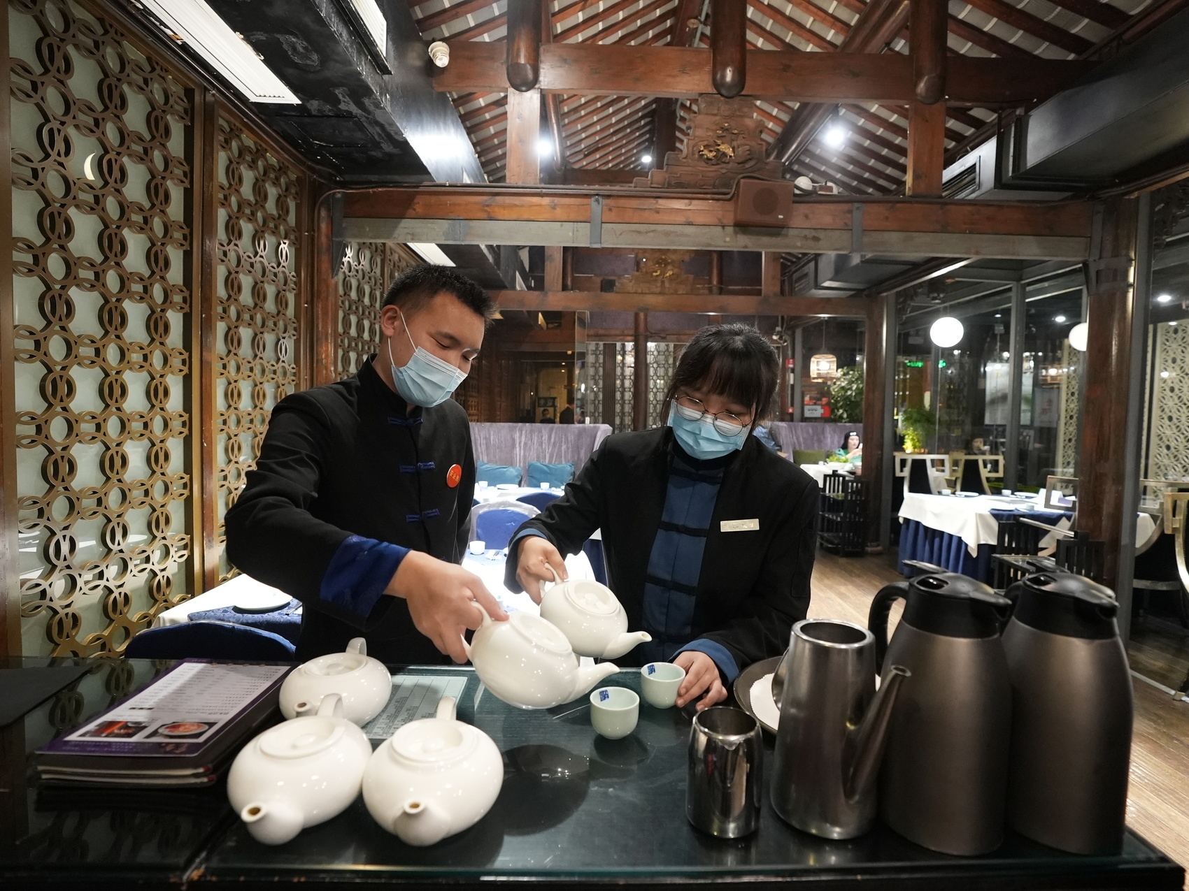 下一秒,这些员工就像刚被撒在盘子里的黄豆,有条不紊、训练有素的各自转进包厢、大厅和后厨,做起最后的准备工作。四川在线记者也跟随着党军霞,开启了半天紧张的见习店长生涯。