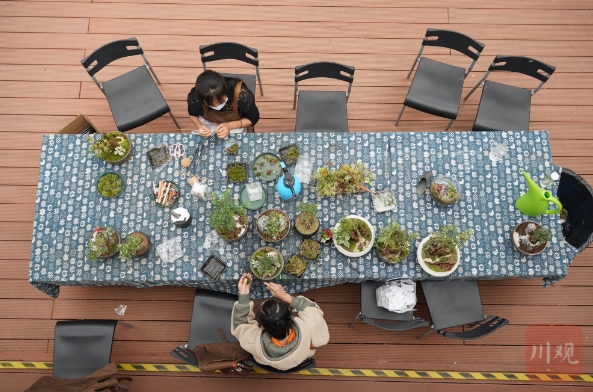 花农王小雪正在进行微观盆景创作(杨柳 摄影)