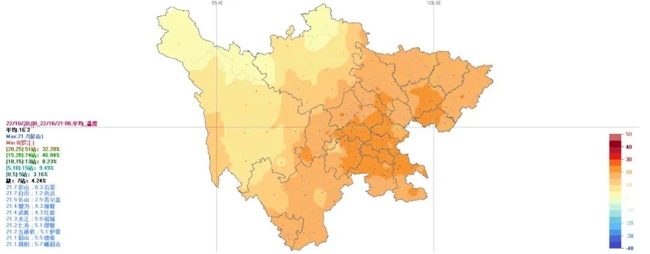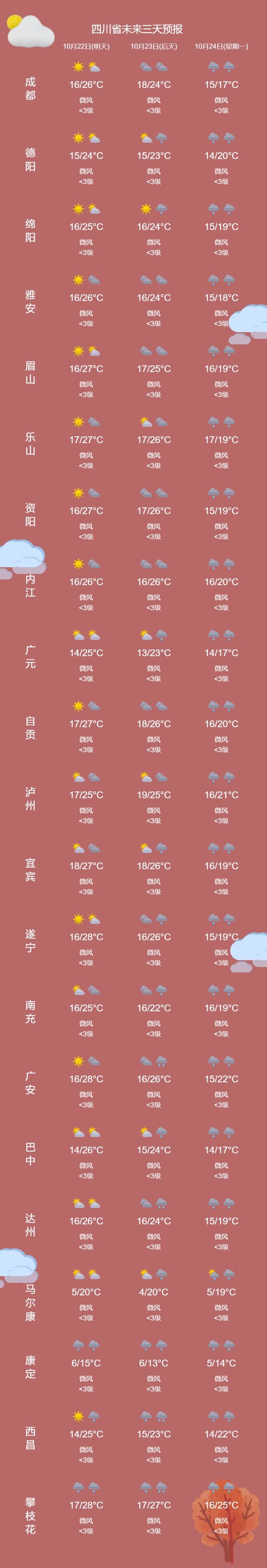 昨天08时到今天08时,盆地最低气温,盆周山区12~14℃,其余地方15~17℃;最高25~28℃。