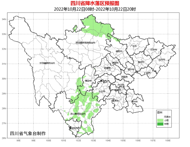 昨天08时到今天08时,全省大部晴,阿坝州北部及盆地个别地方阵雨。