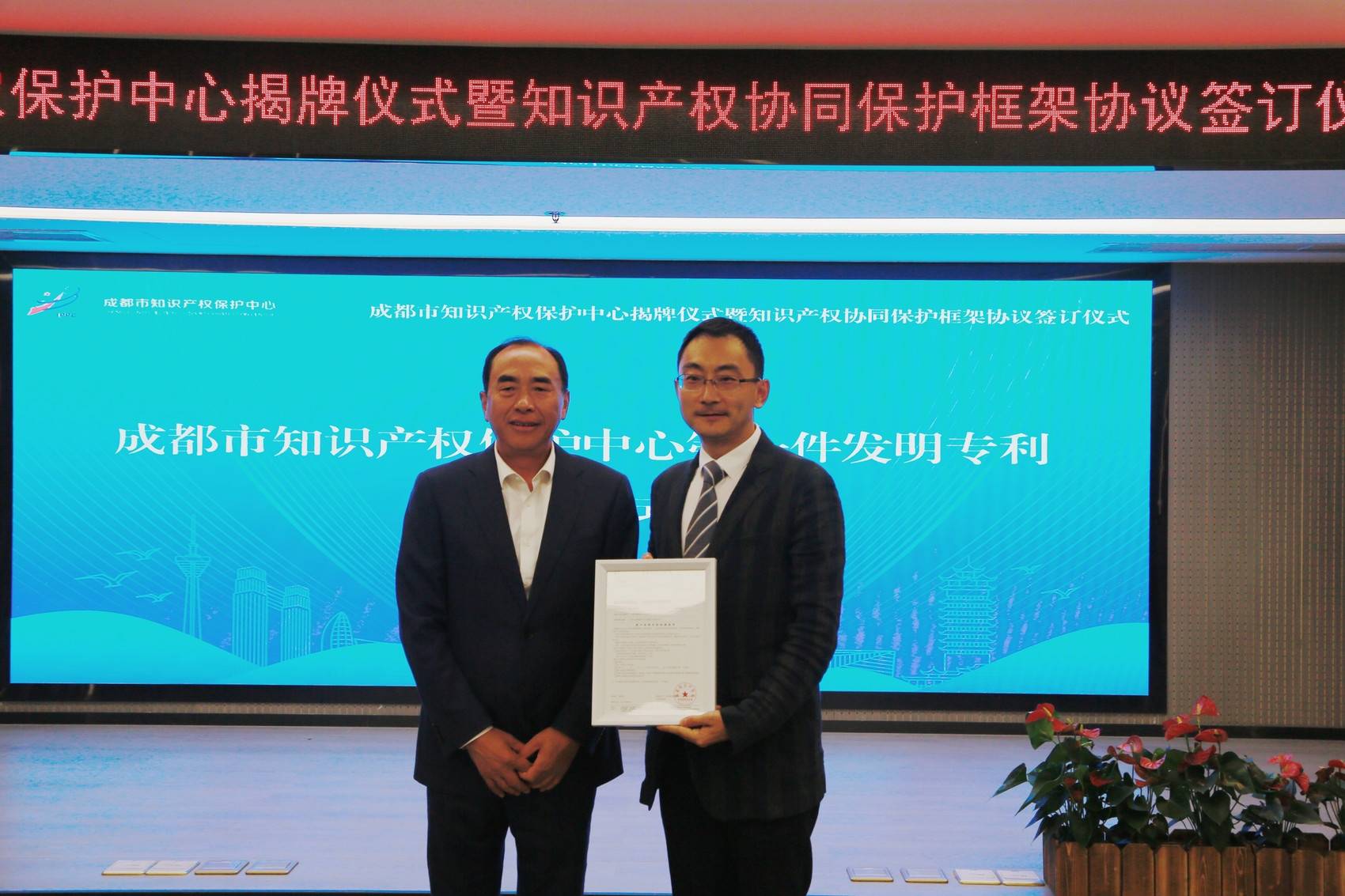 10月25日,成都市知识产权保护中心举行揭牌仪式,四川省知识产权服务促进中心党组书记赵辉为经成都市知识产权保护中心预审授权的第一件专利权利人——成都通德药业有限公司颁发证书。