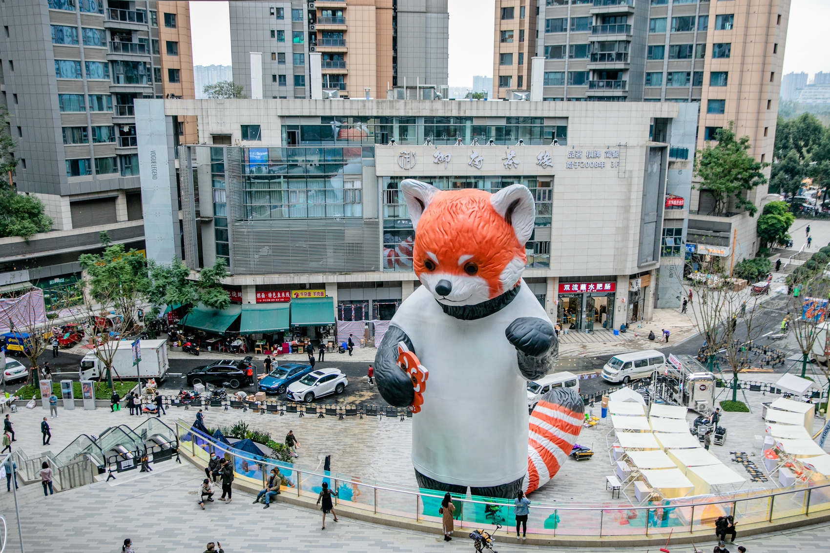 在户外的舞台前,工人们拉上黄色幕布,遮挡住高达17米的小熊猫巨型艺术雕像。“这是国际知名艺术家的作品,明天开业典礼上,我们将摘下幕布,让这个艺术雕像与大家正式见面。”万里说。