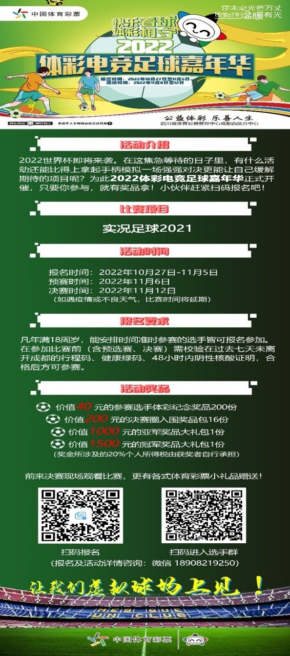 还有不到30天的时间,2022年世界杯就将在卡塔尔鸣响战鼓。在四年一度的足球盛宴即将上演之际,四川省电子竞技运动协会10月27日正式推出“2022体彩电竞足球嘉年华”活动,并对外开启报名通道。
