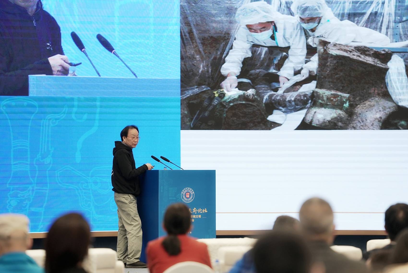三星堆遗址工作站站长雷雨在现场发表主旨演讲时透露,截至9月,三星堆6座新发现祭祀坑已经出土编号文物15109件,近完整器4060件。在明年年底开放的三星堆博物馆新馆,大部分新出土文物将与公众见面。