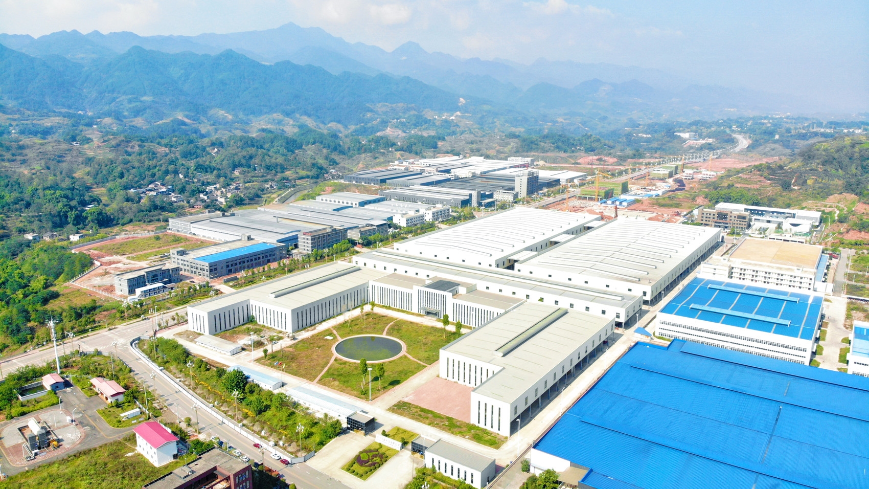 川渝高竹新区是目前全国唯一的跨省域实体化、可视化、一体化共建新区。图为俯瞰川渝高竹新区厂房。 吴迪 摄