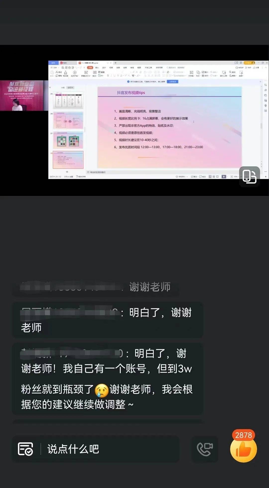 培训过程中,参赛选手围绕选题策划、内容创作等与授课老师进行线上互动。选手王运鑫说:“受益良多,下一步会结合授课老师所讲知识对参赛作品进行优化完善”。选手彭楠新在直播间与授课老师互动频繁,他表示感谢授课老师的指点,自己本身在运营抖音账号,但是粉丝量到3W就到瓶颈了,接下来将根据老师的建议进行调整。