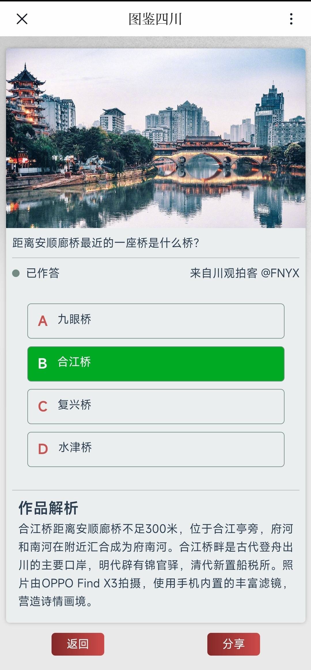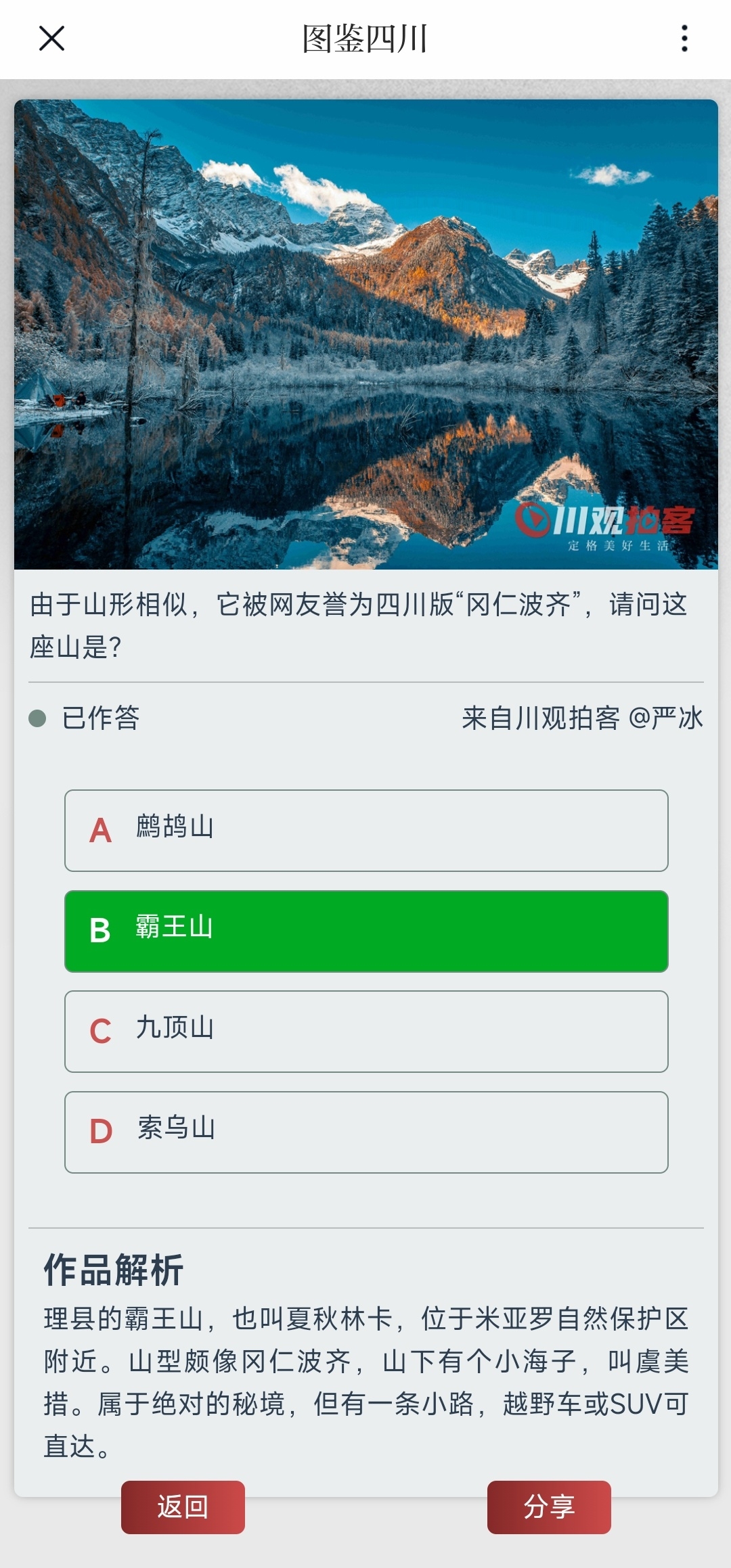 1、“图鉴四川”答题挑战赛是『川观拍客』开办的趣味互动答题栏目,网友可在欣赏美图同时闯关答题,赢取积分抽奖;