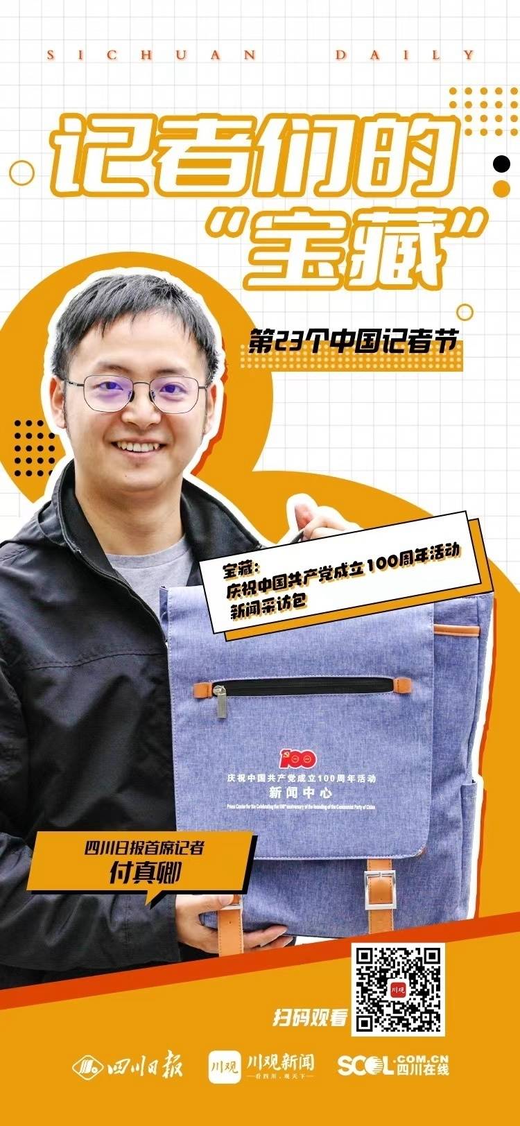四川日报全媒体记者付真卿的“宝藏”,是一个印有“庆祝中国共产党成立100周年活动 新闻中心”字样的采访包。这是他作为四川媒体记者,去年“七一”前往北京采访时,收到的一份工作礼物,包里有采访证、庆祝中国共产党成立100周年大会的请柬等。