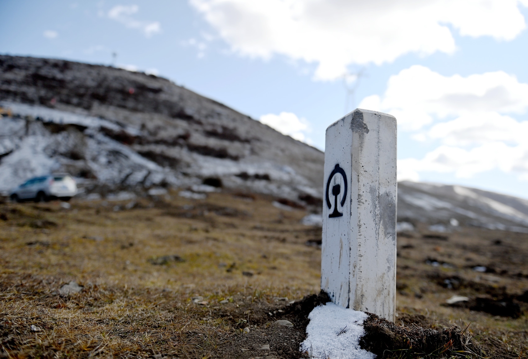 红原2号隧道出口外的铁路线界碑。成兰铁路公司供图