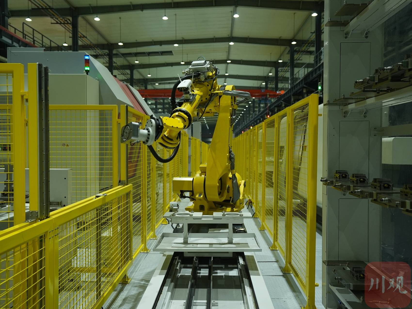 东方汽轮机有限公司叶片加工无人车间内,机器人对生产物料进行夹持、装料操作。
