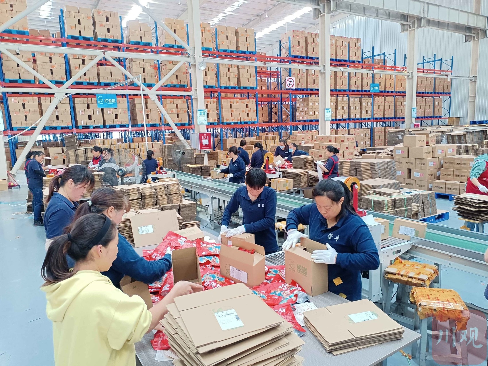 直播间的旁边就是仓库。仓库里,工人们麻利地将酸辣粉、冷吃兔、大头菜等特色农副产品按照订单打包装箱;车间另一头,驻点收货的快递人员,将一件件快递扫描后通过传送带装车。这些食品几天后将到达全国各地的“吃货”手中。