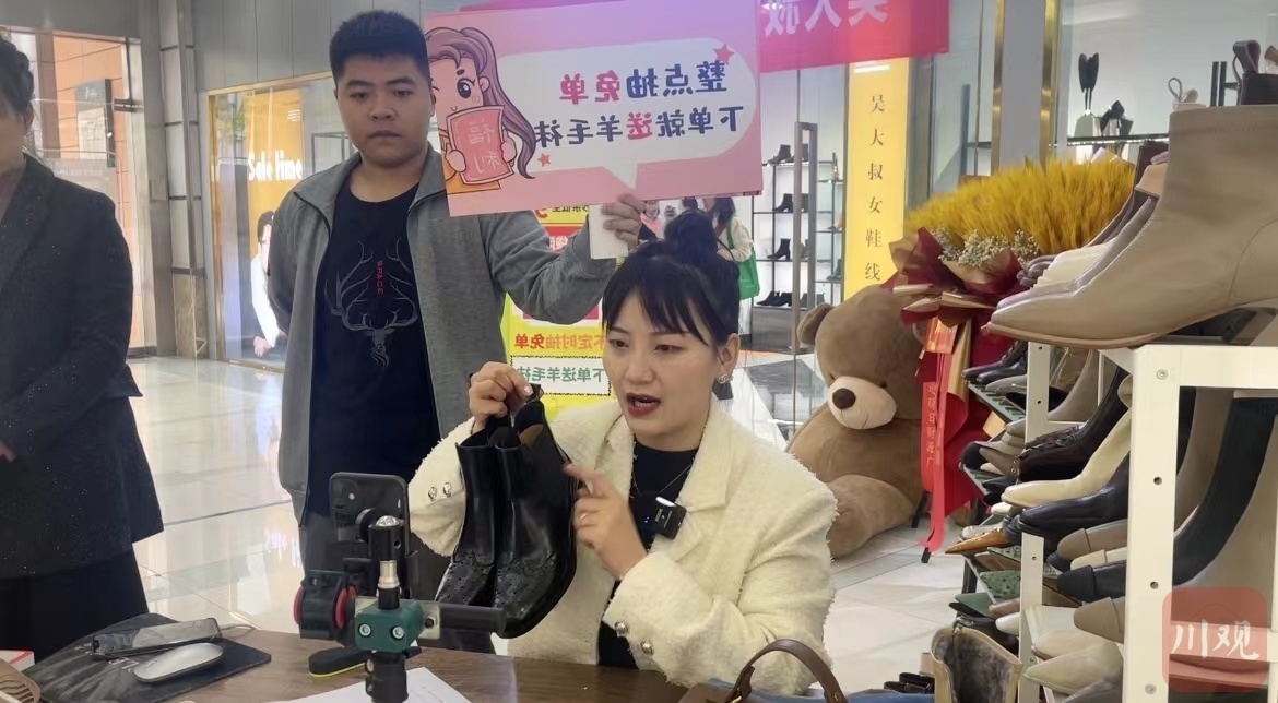 “现在,在直播间里下单这双鞋子,就送一件羊毛衫。”11月7日上午,记者走进成都她妆美谷电商直播基地大厅,看见在一个临时搭建的直播间,主播正在热情地介绍着产品。一旁的工作人员也时刻盯着电脑屏幕,用手势向主播反馈实时销售情况。