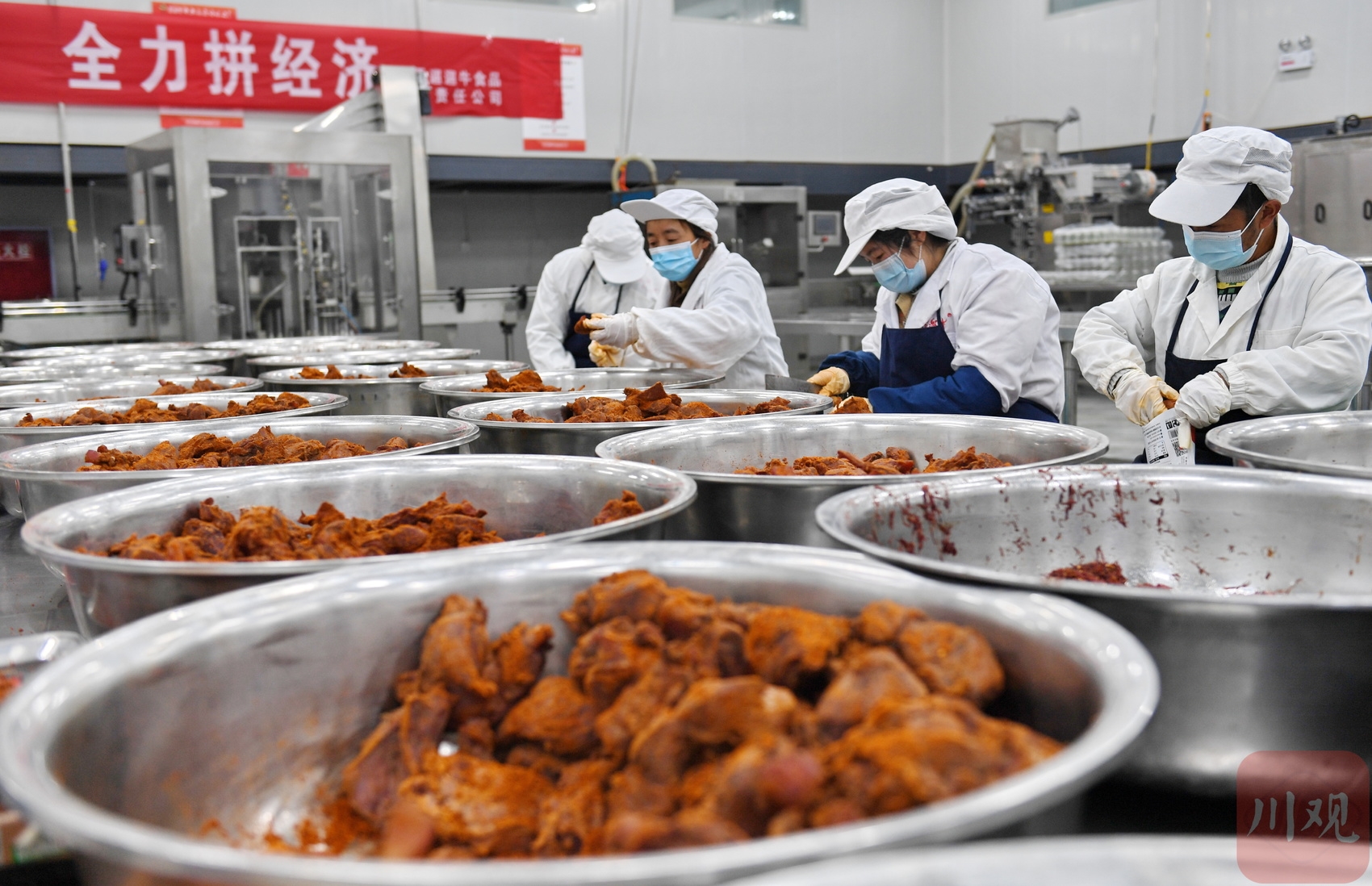 在位于阿坝州红原县的四川红原遛遛牛食品有限责任公司生产车间,工人对牛肉食品进行分装外包。