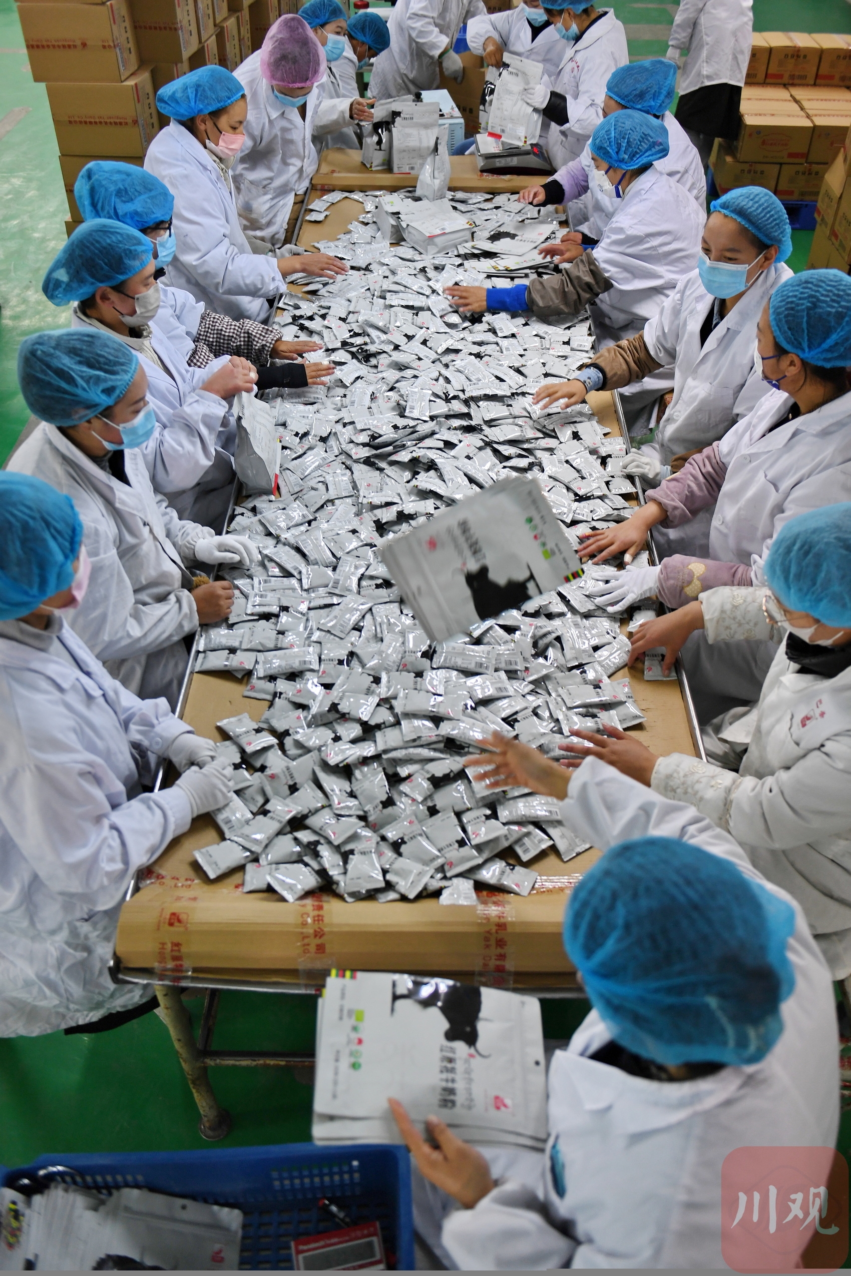 在位于阿坝州红原牦牛乳业有限责任公司外包车间,工人对奶粉进行分装外包。