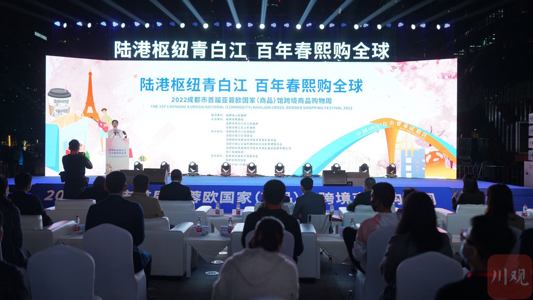 11月11日晚,2022成都市首届亚蓉欧国家(商品)馆跨境商品购物周活动在成都高新区交子音乐广场开幕,来自成都国际铁路港的14个国家(商品)馆集中展销特色跨境商品。