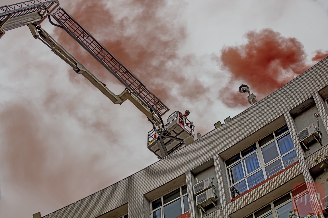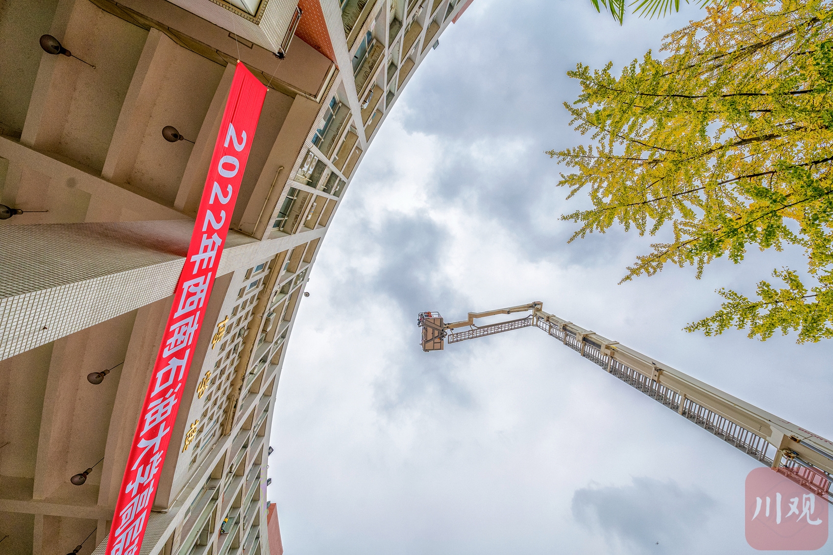 云梯车准备上升至楼顶进行营救(川观拍客 杜宁 摄)