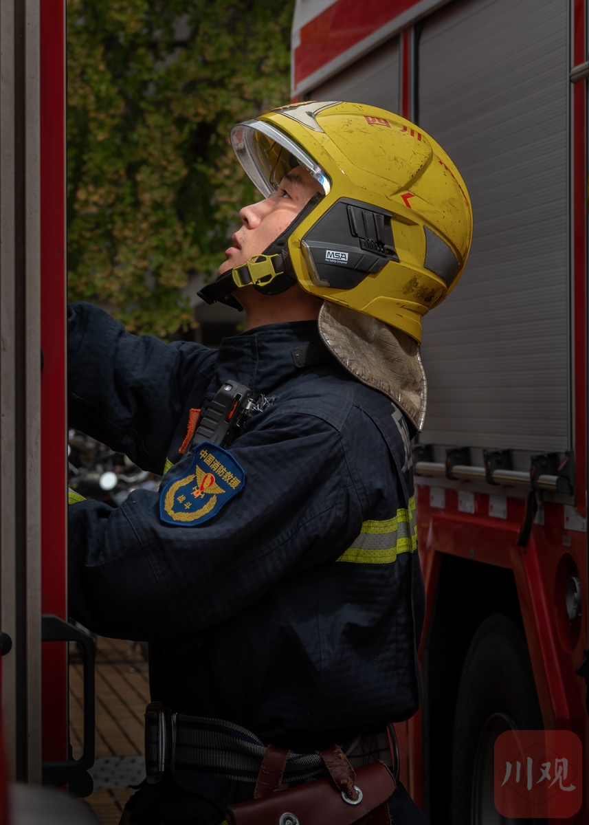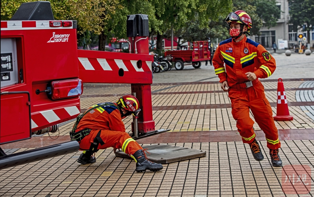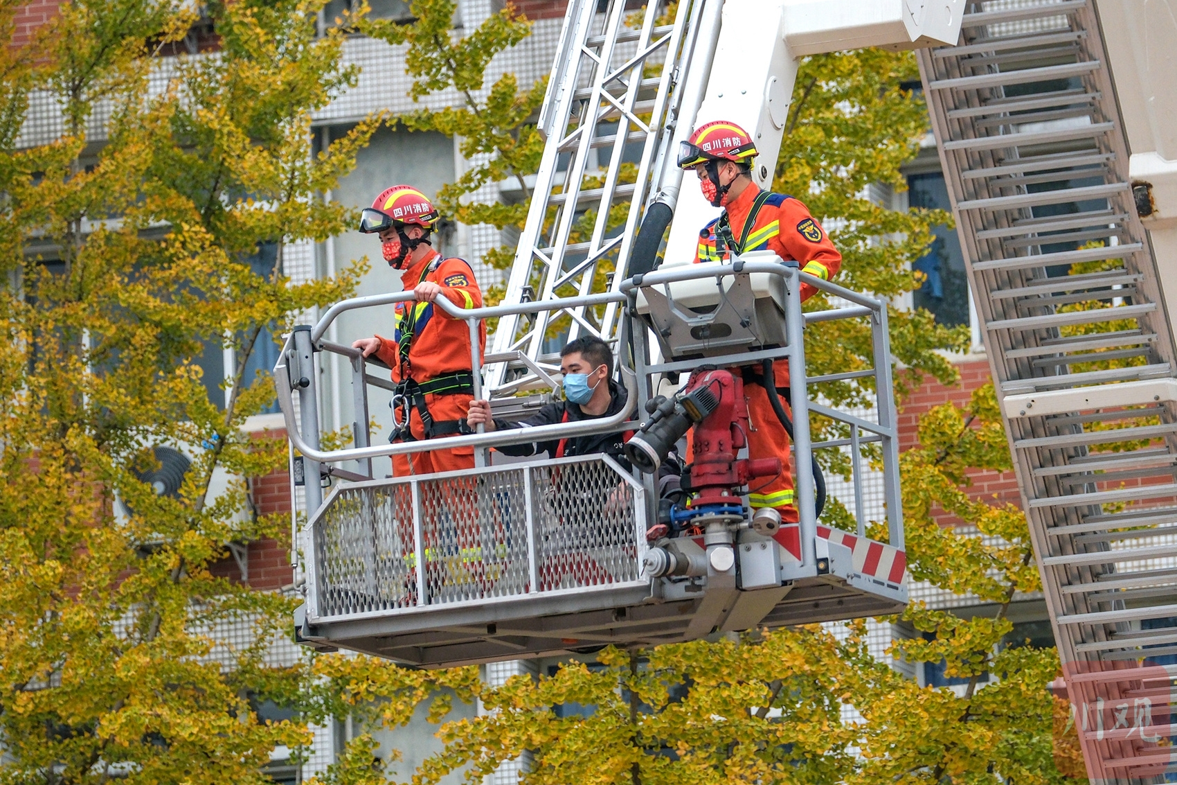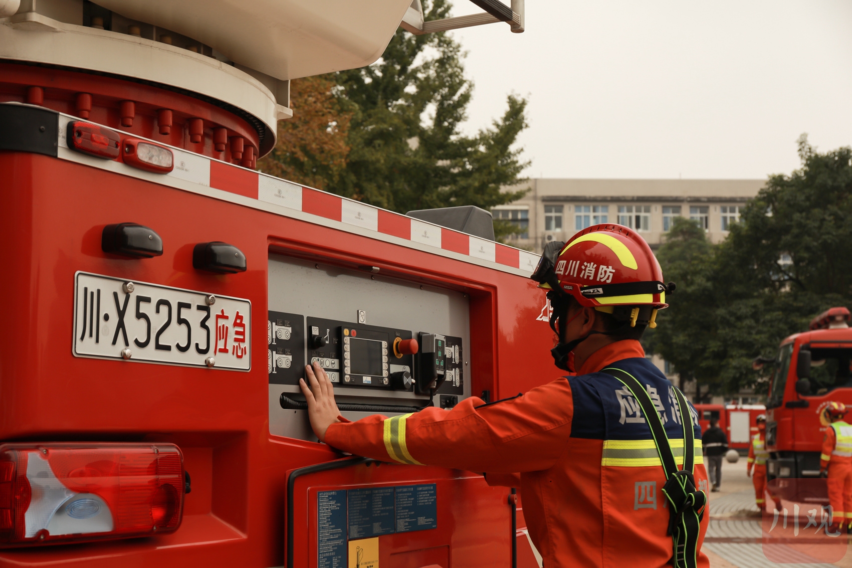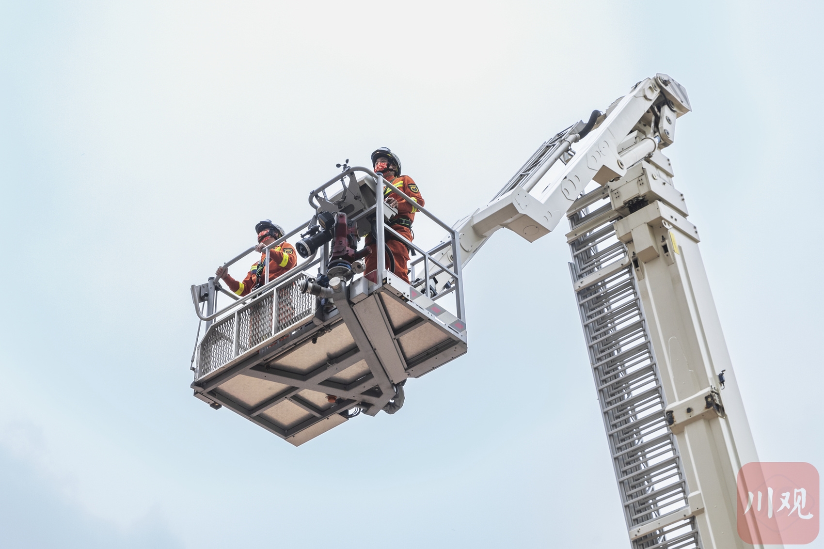 消防救援人员攀往消防车顶操作设备(川观拍客 田鹨 摄)