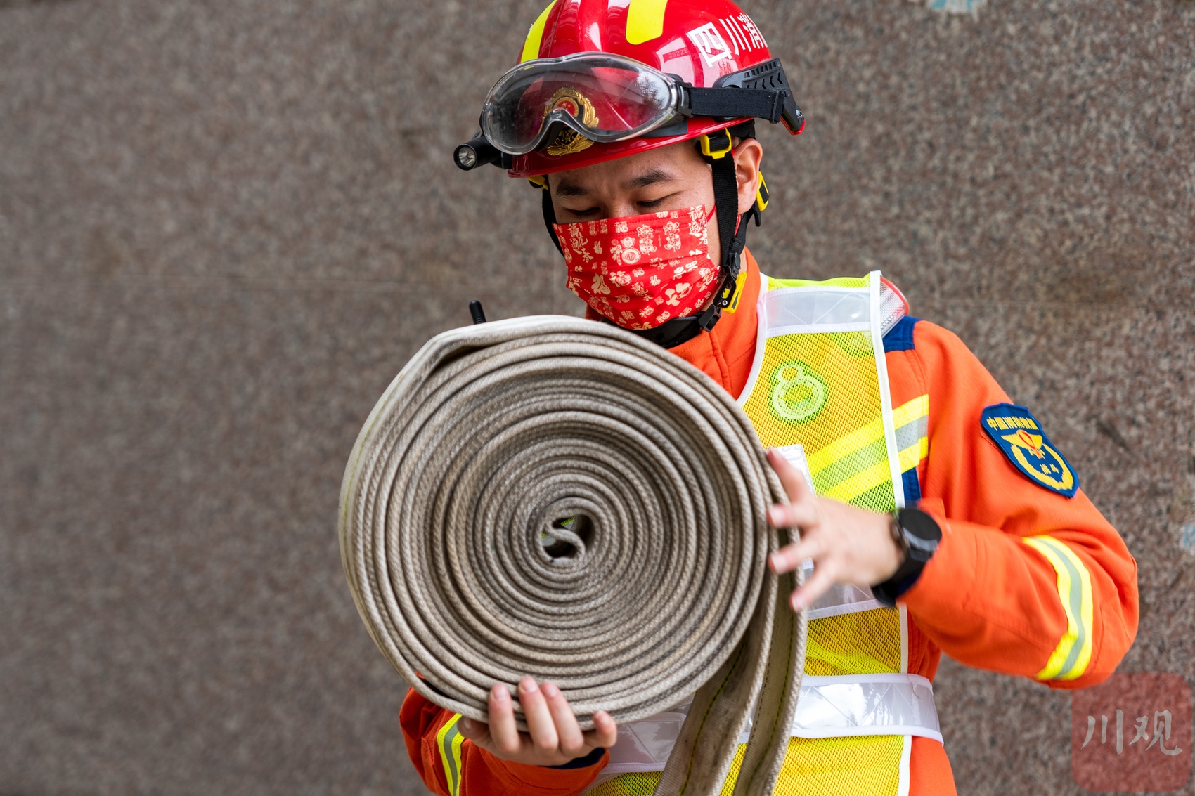 消防救援人员展开水带(川观拍客 张勇 摄)