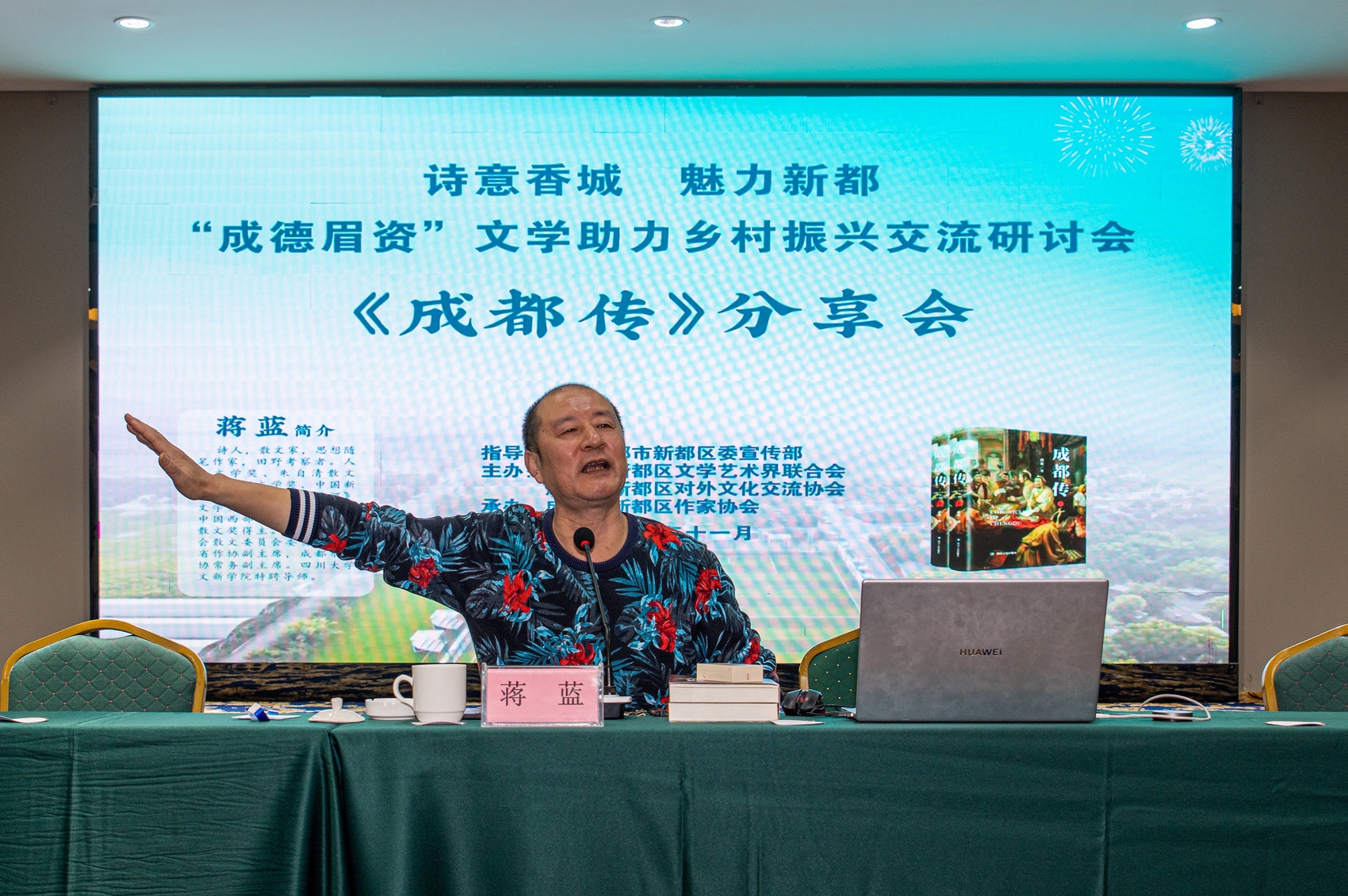 研讨会后,蒋蓝分享了他的新作《成都传》。讲述成都经历十几次的大移民,形成了民族、文化、风俗、园林、饮食、街区、动物植物的落地、开花与繁荣,以及之所以成都近3000年城址不迁、2500年城名不变的底蕴。