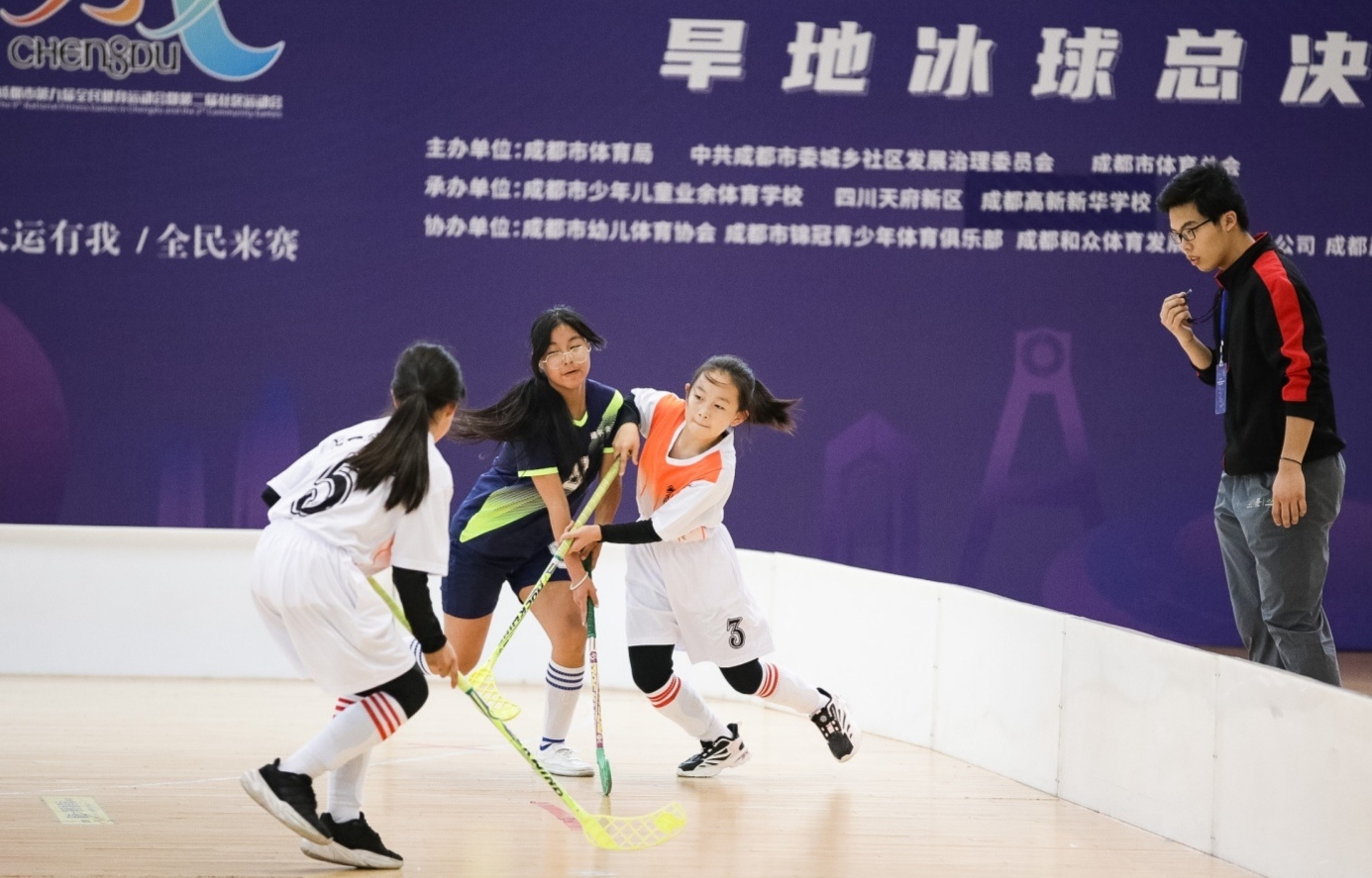 成都市第九届全民健身运动会暨第二届社区运动会旱地冰球总决赛设置男、女子甲、乙组4个组别,来自成都市11所中、小学校的16支队伍,共200余名运动员参赛,他们为大家呈现了28场精彩角逐。据不完全统计,目前成都市旱地冰球人口接近3万人,较早开展旱地冰球项目的30多所中小学分布在龙泉驿区、温江区、郫都区、天府新区。校园班级联赛、校际联赛逐年增多,旱地冰球不仅成为同学们喜闻乐见的新兴校园项目,而且逐渐融入成都市青少年轮滑冰球和冰球赛事体系,持续助力冰球运动的发展。