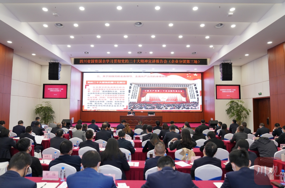 11月14日,四川省国资国企学习贯彻党的二十大精神宣讲报告会在四川能投集团举行。这是省委宣讲团企业宣讲分团走进国有企业开展的专题宣讲,省委宣讲团企业宣讲分团副团长、省国资委党委专职副书记吴晓曦作宣讲报告,四川能投集团和川投集团、四川国际博览集团、国宝人寿、四川银行、紫坪铺公司等省属国有企业的90余名干部职工代表在现场聆听了宣讲报告。