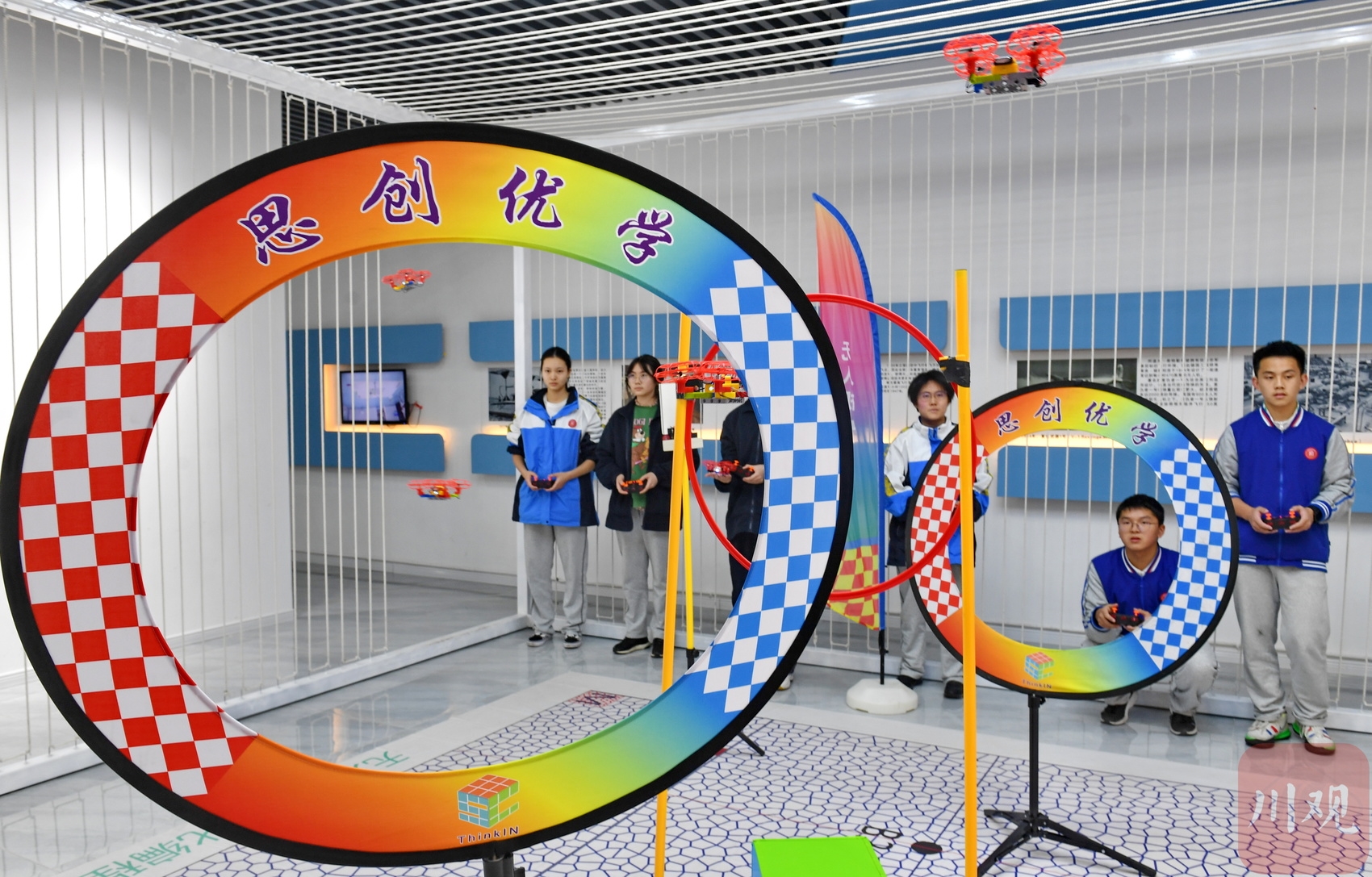 11月16日,成都市中和中学的学生在兴趣班上进行无人机穿越障碍训练。