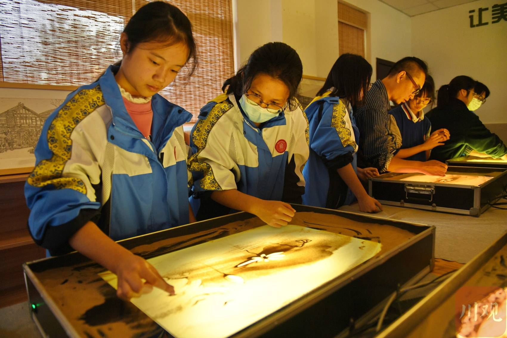 11月16日,成都市中和中学的学生在兴趣班上学习沙画。