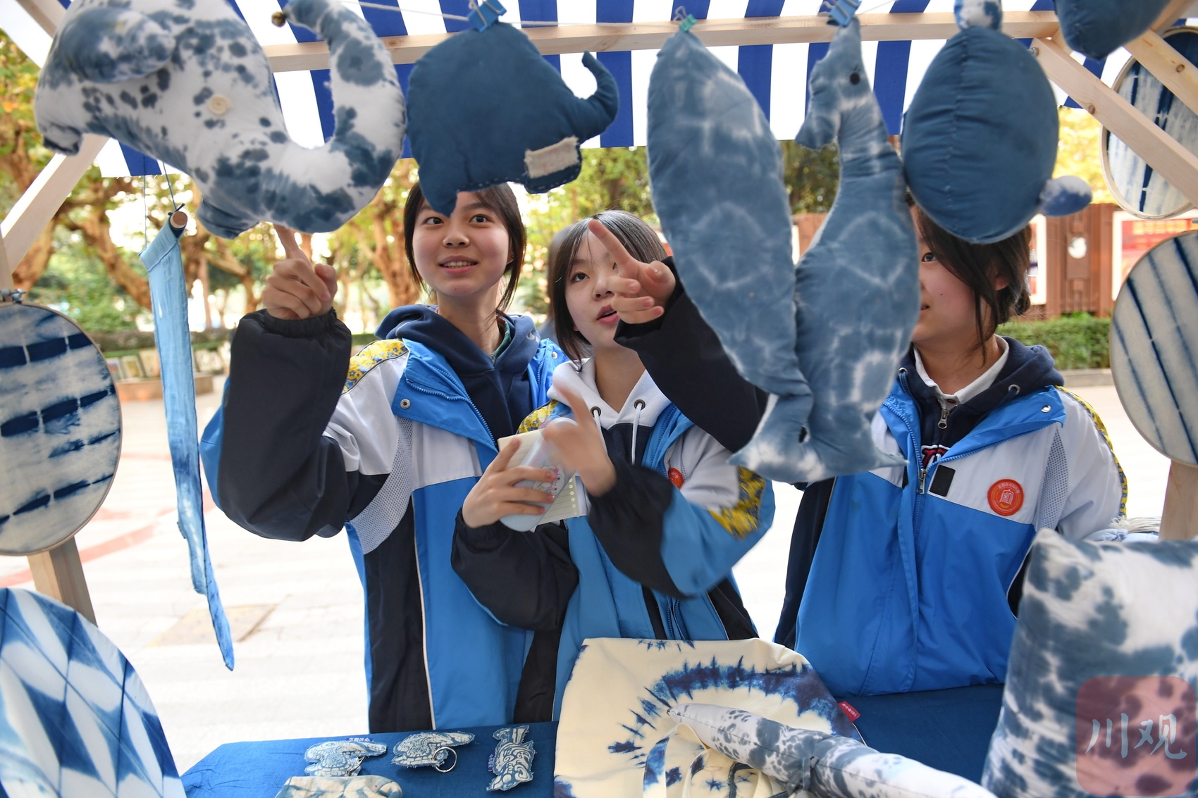 11月16日,成都市中和中学的学生在兴趣班上展示自己制作的扎染作品。