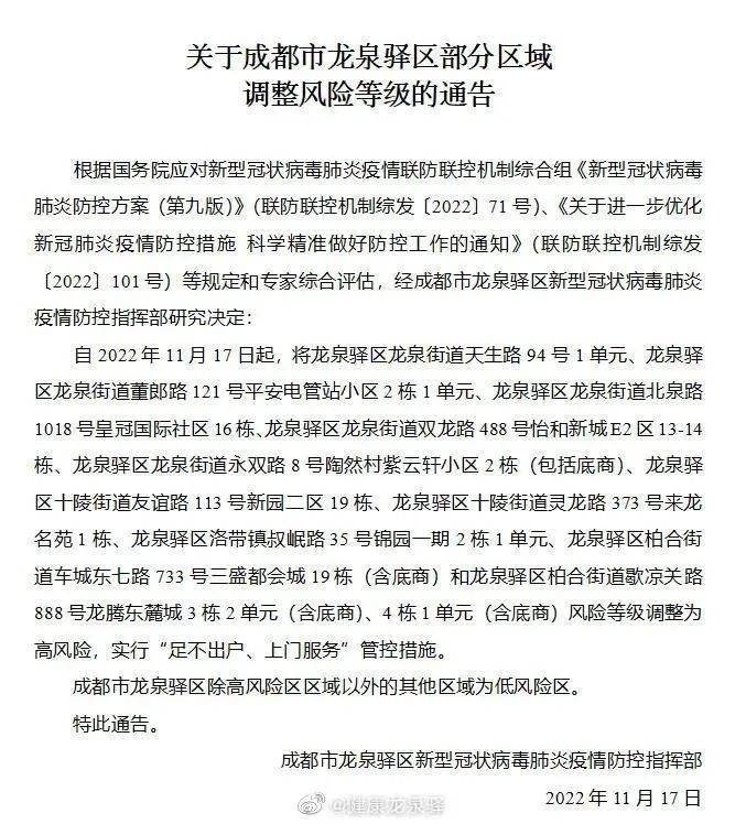 11月17日及18日凌晨,成华区、武侯区、天府新区、龙泉驿区、双流区、温江区、新都区发布最新通告:调整部分区域风险等级。高新区发布关于疫情防控咨询电话恢复24小时值守的通告。
