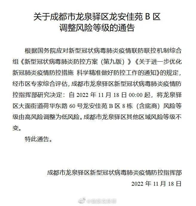 自2022年11月18日0时起,将武侯区浆洗街街道置信北街1号双楠谊苑10栋3单元(含底商)、浆洗街街道武侯祠大街37号泰达锦和名邸1单元、浆洗街街道一环路南四段19号锦外中心1单元由高风险区调整为低风险区。