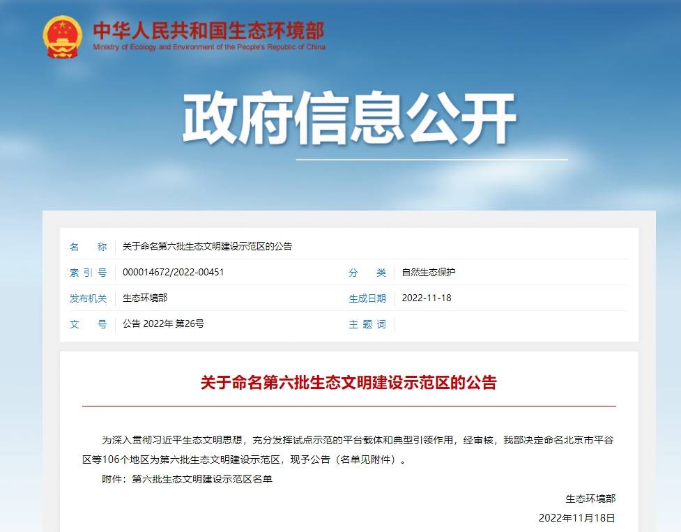 据生态环境部官网消息,为深入贯彻习近平生态文明思想,充分发挥试点示范的平台载体和典型引领作用,经审核,我部决定命名北京市平谷区等106个地区为第六批生态文明建设示范区,现予公告(名单见附件)。