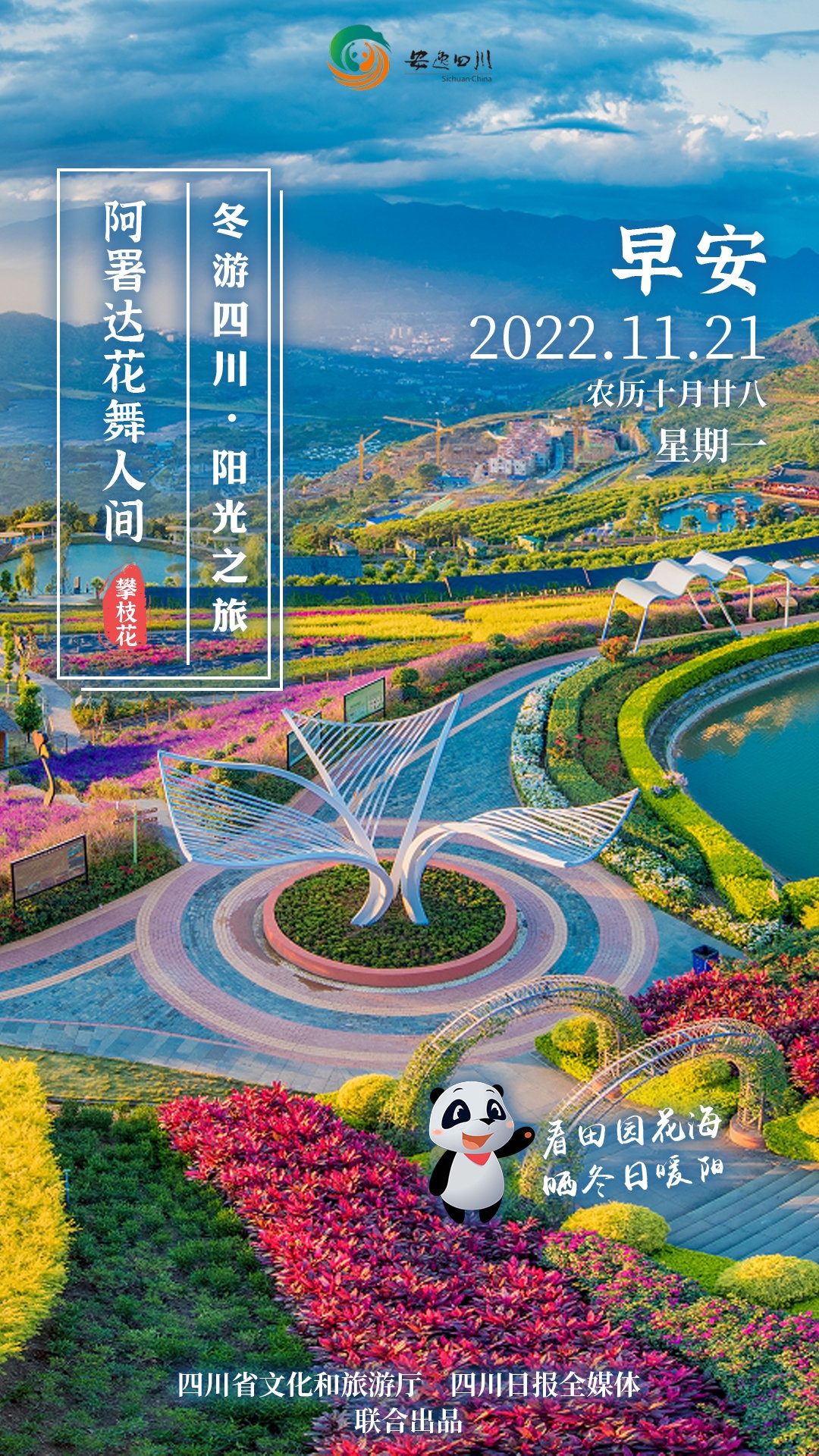 11月21日,星期一。今日冬游四川日历海报走进位于攀枝花市东区阿署达村的花舞人间,看田园花海、晒冬日暖阳。