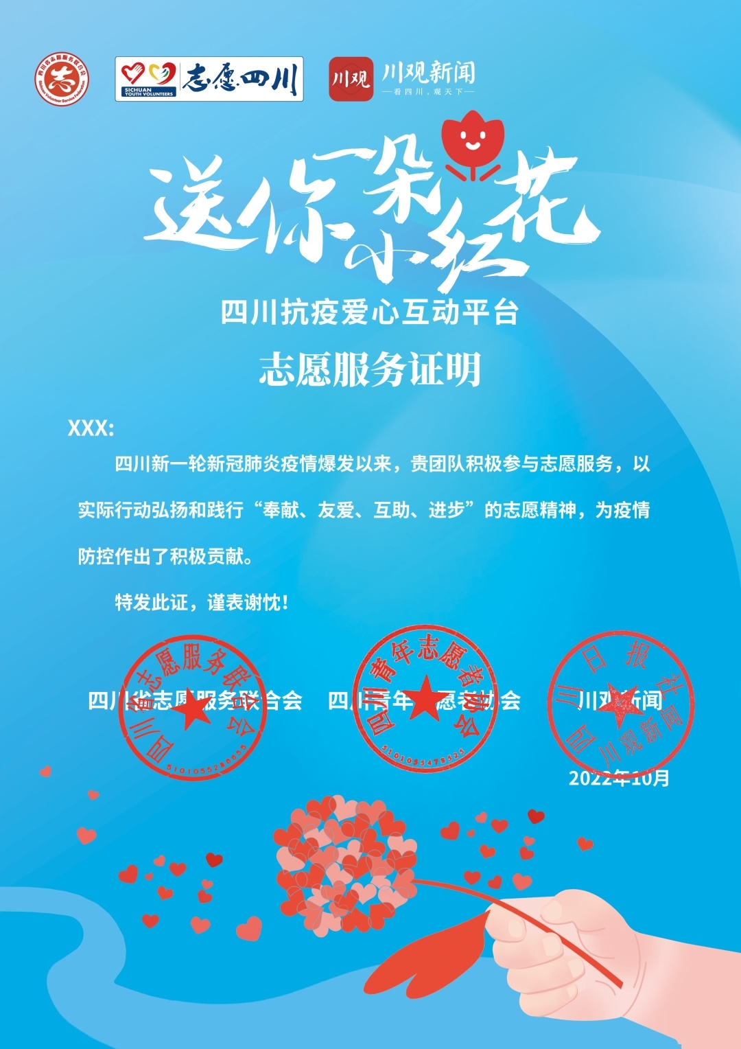 9月2日,川观新闻联合四川省志愿服务联合会、四川青年志愿者协会启动“送你一朵小红花——寻找你身边大美抗疫志愿服务团队和志愿者”活动,展示了超2000个来自社会各领域的大美志愿服务团队和志愿者的大美事迹,向全省参与疫情防控一线服务工作的志愿者和志愿服务团队发放抗疫志愿服务电子证明。目前,已有23万人次领取。