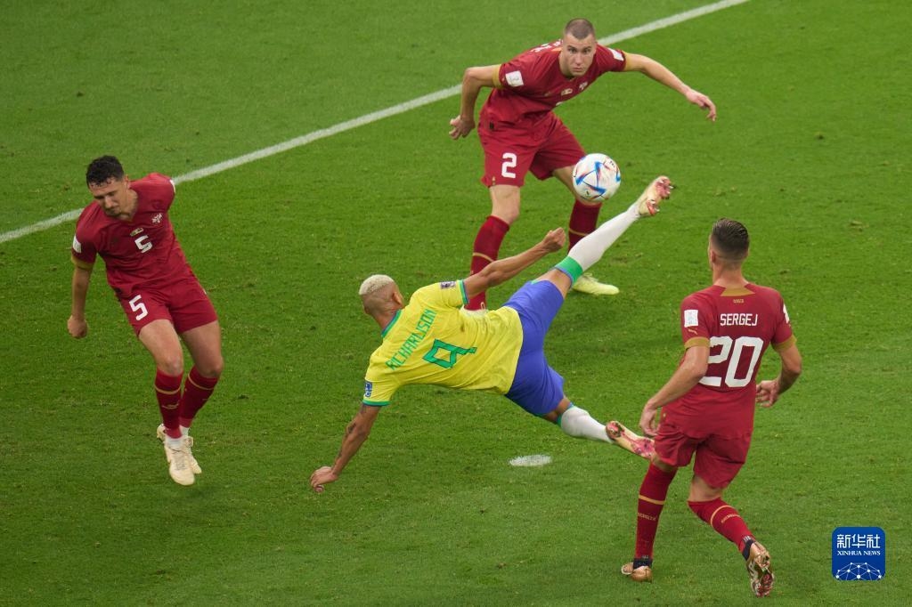 11月24日,巴西队球员理查利森射门得分。新华社记者 孟鼎博 摄