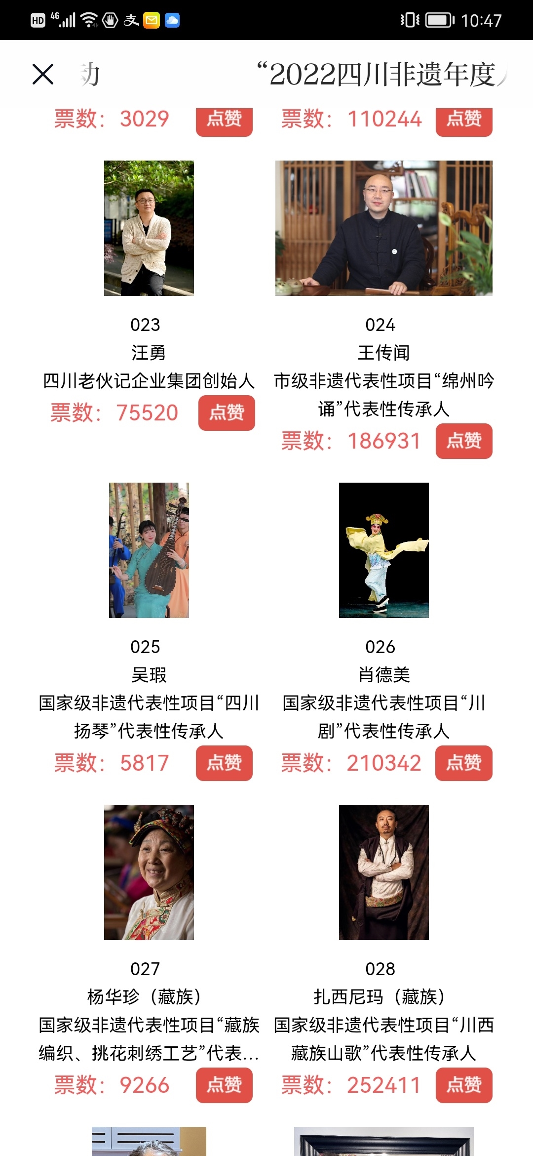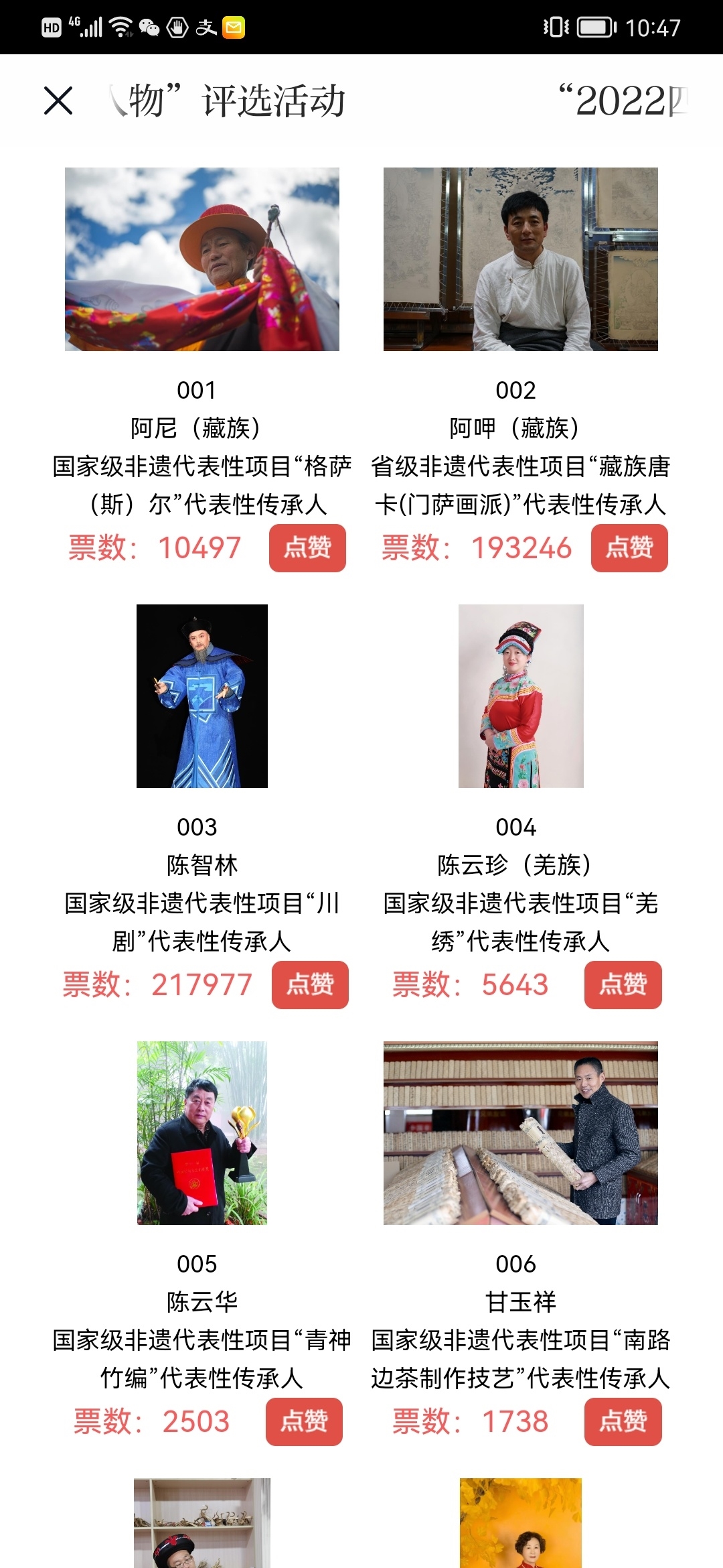 “2022四川非遗年度人物”评选活动由四川省文化和旅游厅主办、四川日报社承办,11月11日起公布30位提名人名单,网络投票也同日正式开启。30位提名人一经公布,便受到了社会各界关注,网友纷纷进入川观新闻APP首页的投票活动,为心中的非遗年度人物点赞。记者看到,点赞最高的前两位提名者认知度相对较高。“黄老五”花生糖的传承人黄老五获得的点赞数持续遥遥领先,总点赞数达到255164票;藏族山歌王子扎西尼玛同样因为歌曲的传唱,点赞量紧随其后,达到252411票。当然,实力派非遗人同样拥有极高的认可度。今年凭借《草鞋县令》获得文华大奖的川剧表演艺术家、川剧的国家级非遗传承人陈智林,获得了217977点赞量;同样出演了《草鞋县令》的川剧表演艺术家肖德美的点赞数也达到了210342票。此外,在非遗扶贫方面做出贡献的国家级非遗觉囊梵音传承人嘉阳乐住受到了网友热情点赞,投票数达到了220885;而看上去便武功高绝的国家级非遗青城武术的传承人何道君,点赞数也高达171190票。