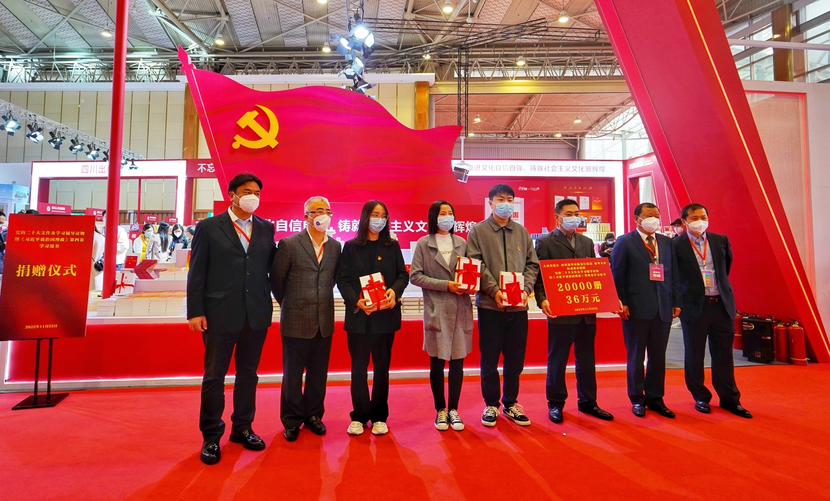 11月25日上午,在2022天府书展主题图书展上,人民出版社、四川新华出版发行集团、新华文轩出版传媒股份有限公司向成都市了捐赠党的二十大文件及学习辅导读物和《习近平谈治国理政》第四卷捐赠仪式,本次向成都市捐赠党的二十大文件及学习辅导读物和《习近平谈治国理政》第四卷共计2万册,码洋36万元。