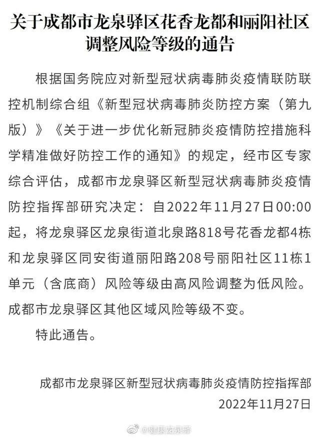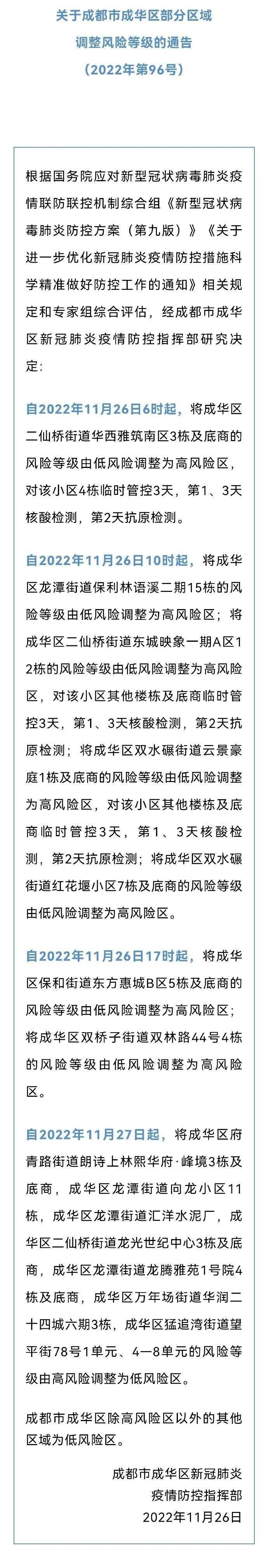 自2022年11月24日起,将茶店子街道同和路99号惠民苑8栋、10栋、12栋、13栋、15栋;茶店子街道阳曦芙蓉城5栋;沙河源街道川建大院42栋、43栋;沙河源街道古柏村4组15号院落;沙河源街道蓝光花满庭5栋1单元、2单元及底商,6栋1、2单元;沙河源街道源上金府1栋;天回镇街道金凤凰大道588号2栋;天回镇街道万圣家园A区2栋的风险等级调整为高风险区。