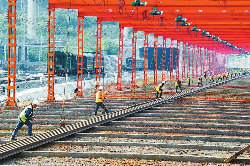 11月22日,施工人员在汉巴南铁路巴中东站铺轨基地运输单根500米长、30吨重的长钢轨。截至目前,巴中至南充段路基工程完成94.62%,桥梁工程完成91.5%,隧道工程完成98.5%,这条铁路预计2024年5月底开通。