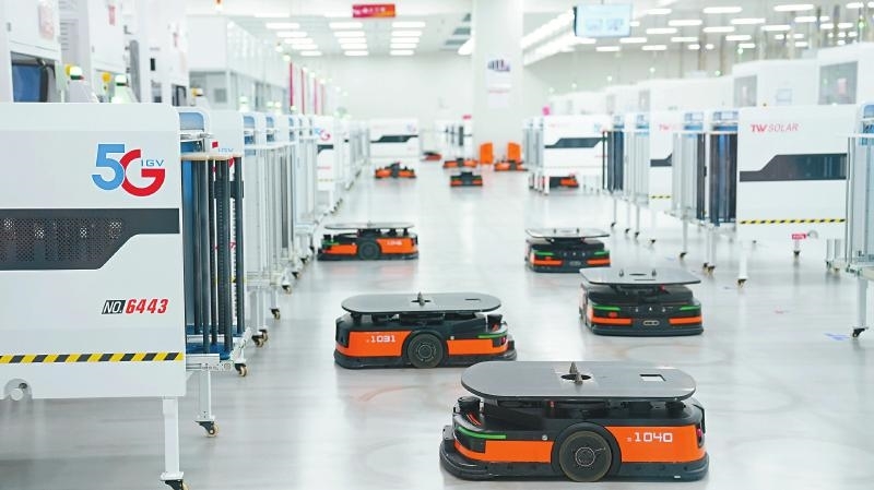 11月10日,200多台IGV智能机器人在通威太阳能金堂基地的生产线间来回搬运物料。这里是全国重要的太阳能电池片生产地之一,每天有上百万电池片从这里走向世界各地。