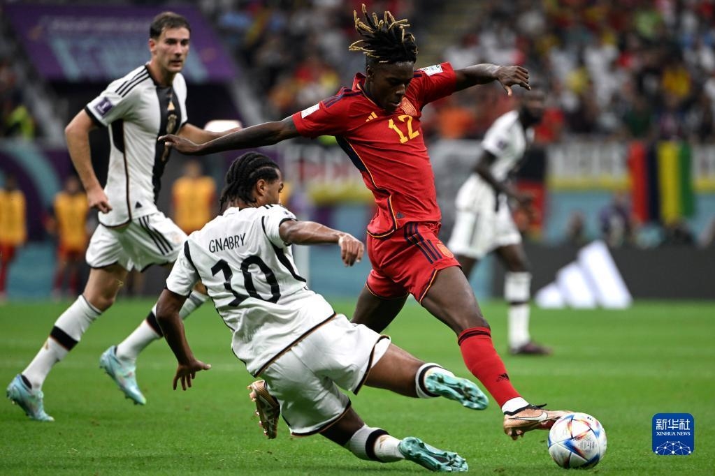 11月27日,西班牙球员与德国球员在比赛中拼抢。新华社记者 李尕摄
