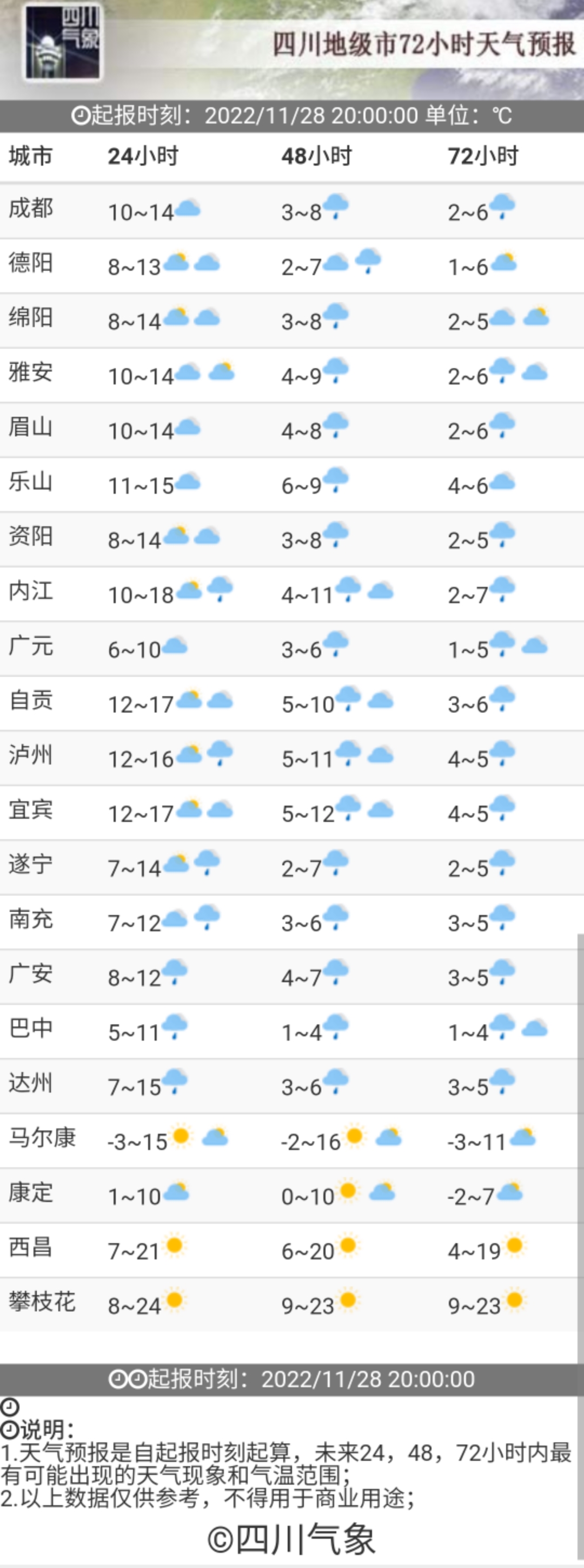 成都市→预计11月28日傍晚开始至12月1日,成都市日平均气温将累计下降8~10℃,大部分地方有4~6级偏北风,东部局部地方可达7级或以上,30日前后高海拔地区有小雪或雨夹雪。