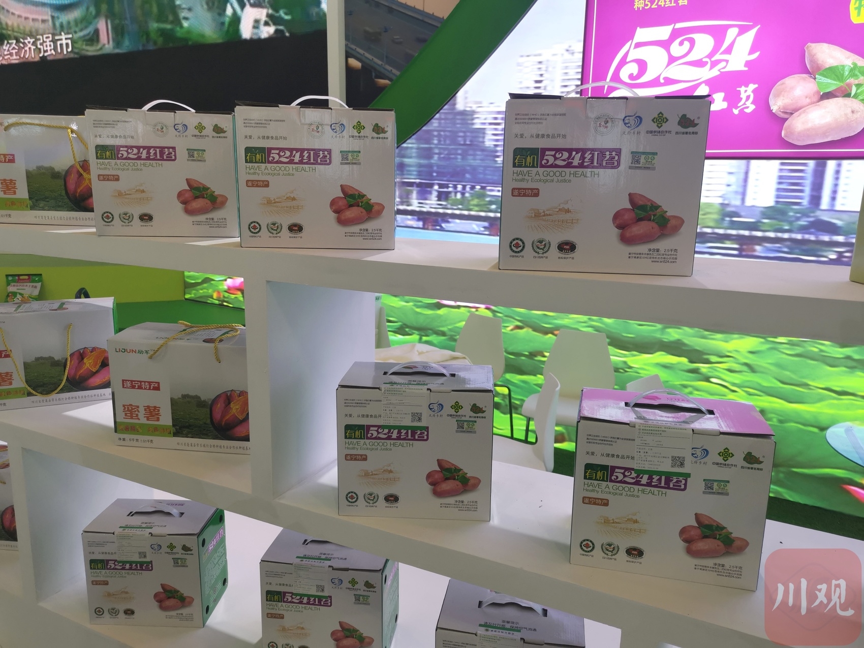 在展品架上,一款名为“有机524红苕”的包装盒整齐排列。周小霞介绍,524红苕因其“5月栽种、2两一根、4寸种植间距”而得名。