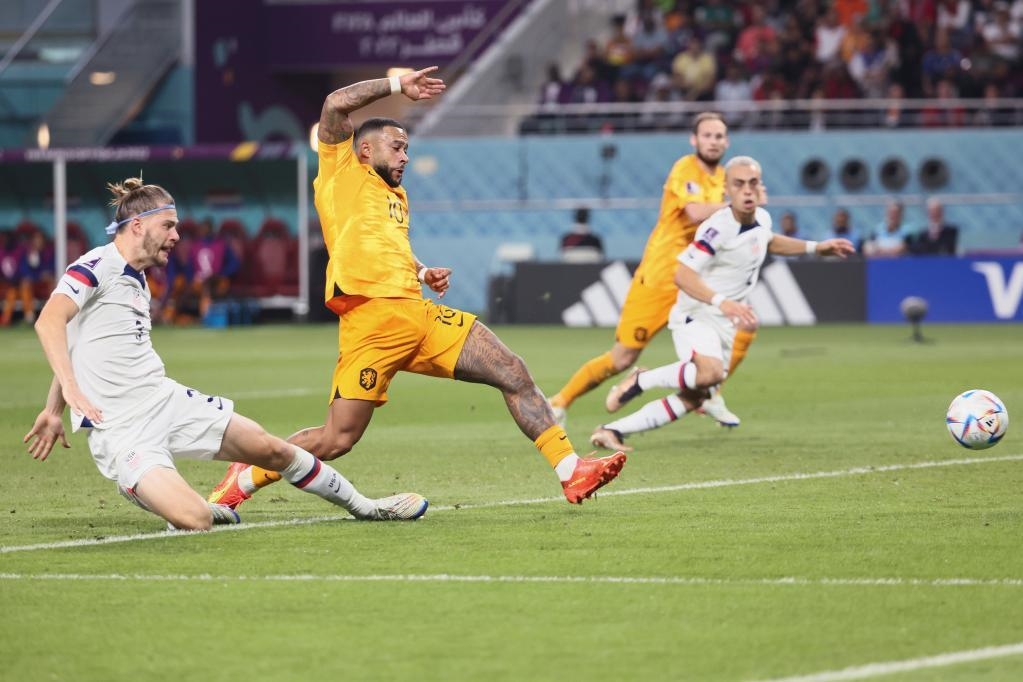 12月3日,荷兰队球员孟菲斯·德佩(左二)在比赛中射门。新华社记者 兰红光 摄