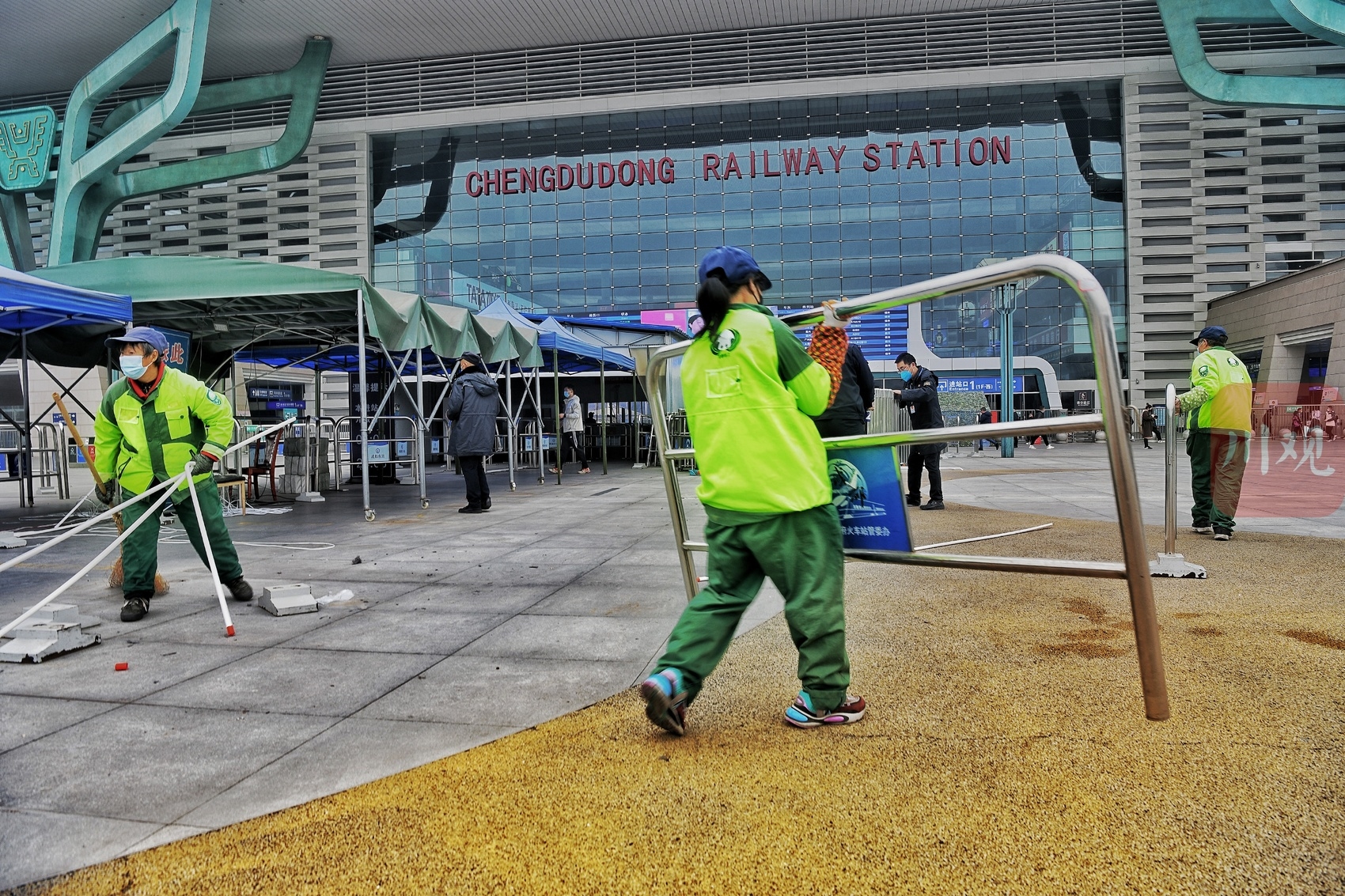 12月8日,四川在线记者在成都东站西广场看到,工作人员正在拆除防疫检测通道。乘客也只需刷身份证或车票即可进站乘车。