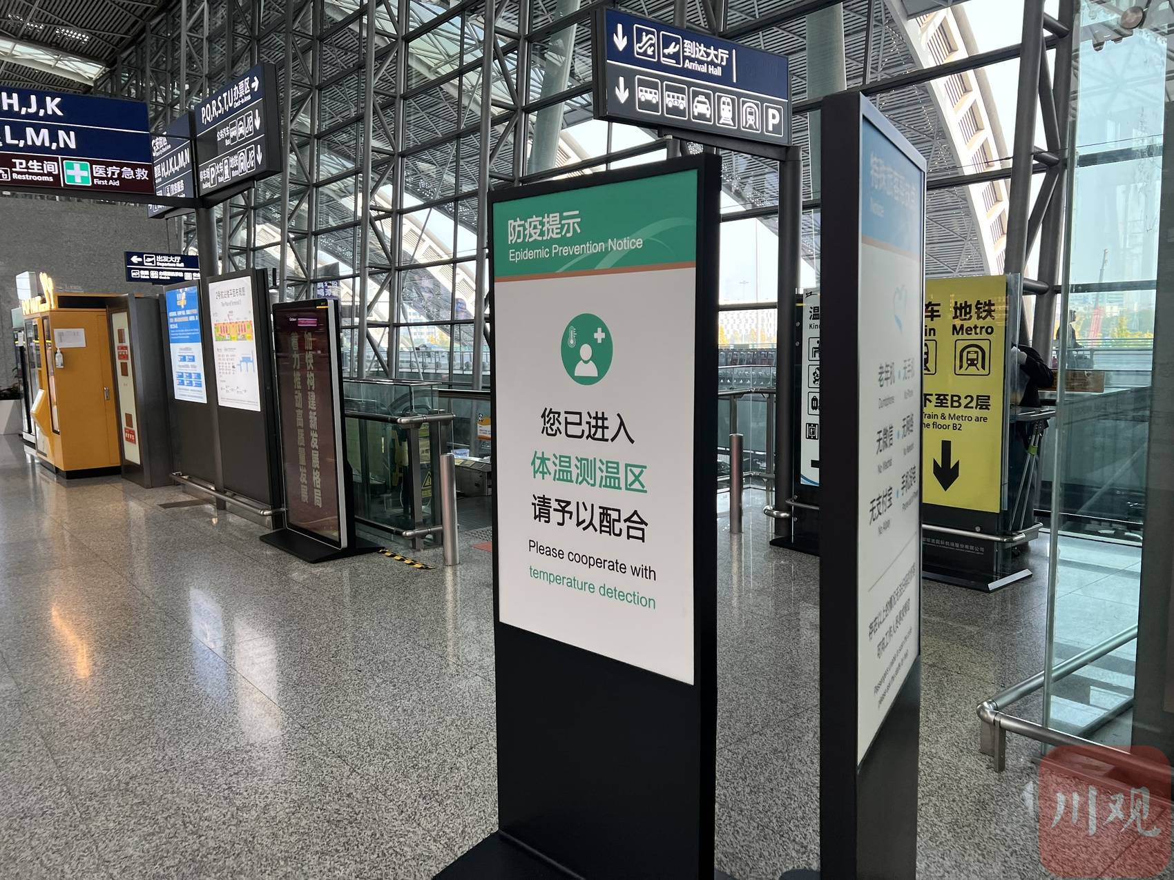 双流机场T2航站楼内的防疫提示牌。