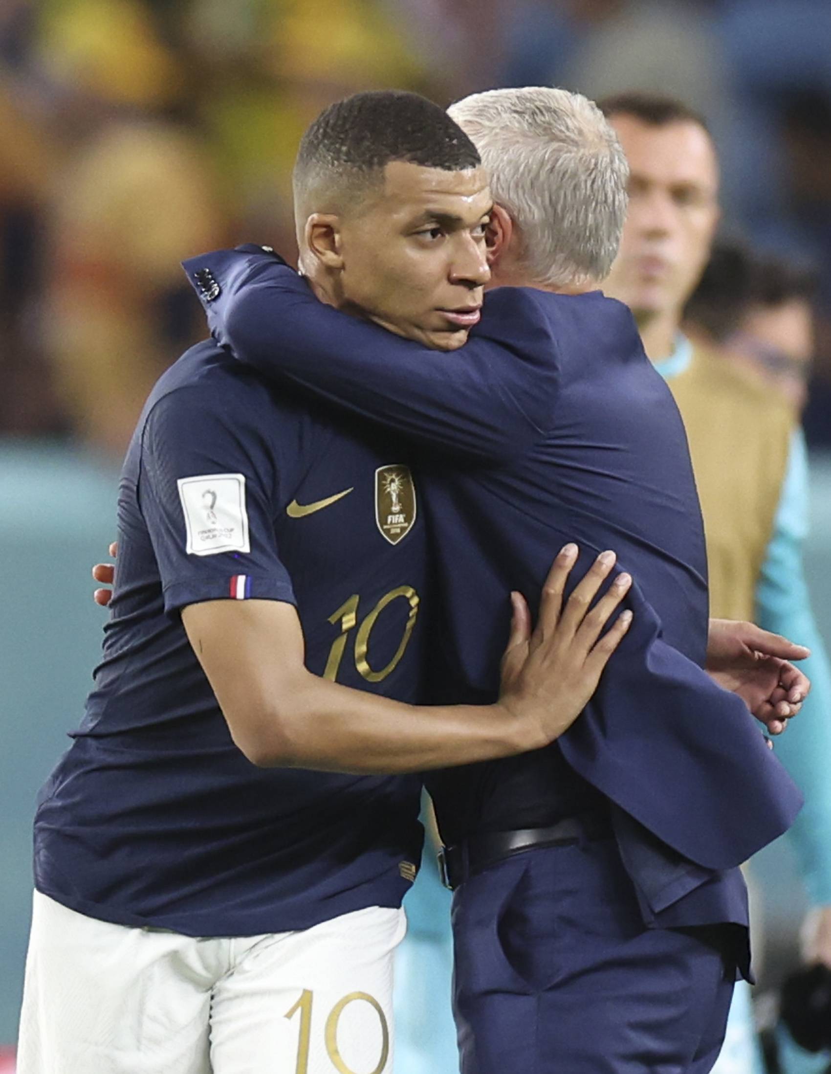 11月22日,法国队球员姆巴佩(左)与主教练德尚在比赛后庆祝。新华社记者 李明 摄
