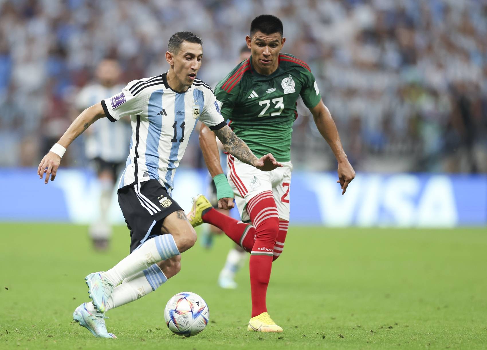 11月26日,阿根廷队球员迪玛利亚(左)在对阵墨西哥队的比赛中突破。新华社记者 潘昱龙 摄