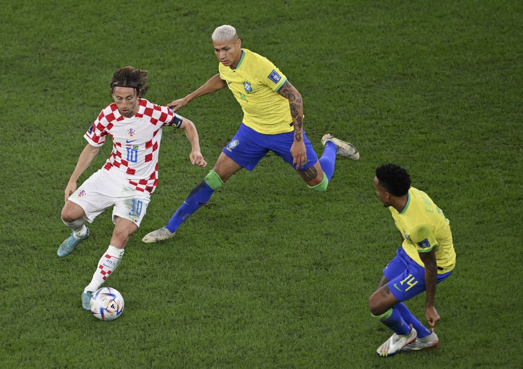 12月9日,克罗地亚队球员莫德里奇(左)与巴西队球员理查利森(中)、米利唐在比赛中拼抢。新华社记者 夏一方 摄
